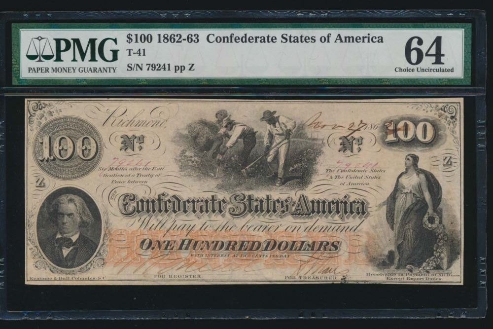 One 1862-63 $100 Confederate States of America Note PMG 64.