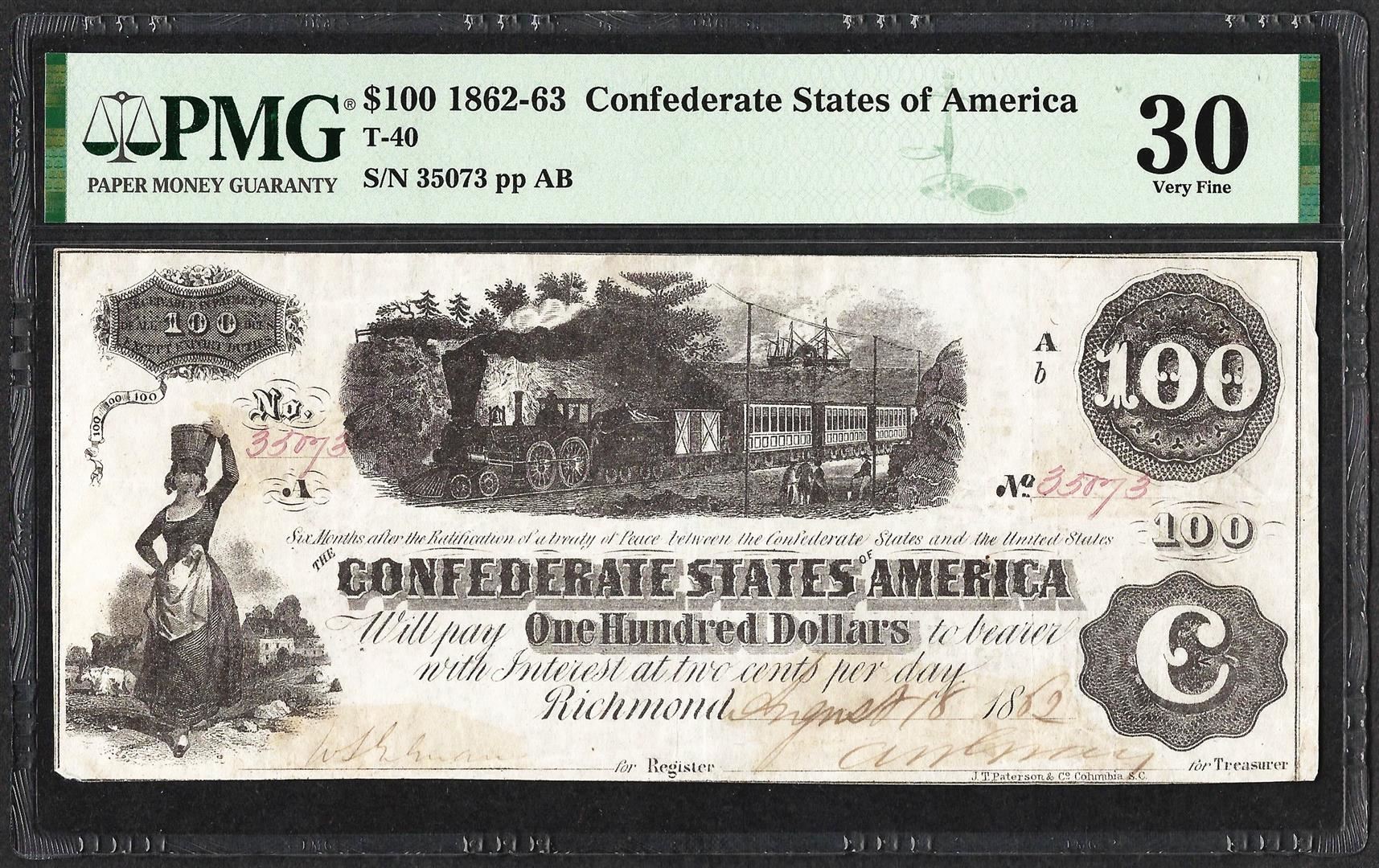 1862-63 $100 Confederate States of America Note T-40 PMG Very Fine 30