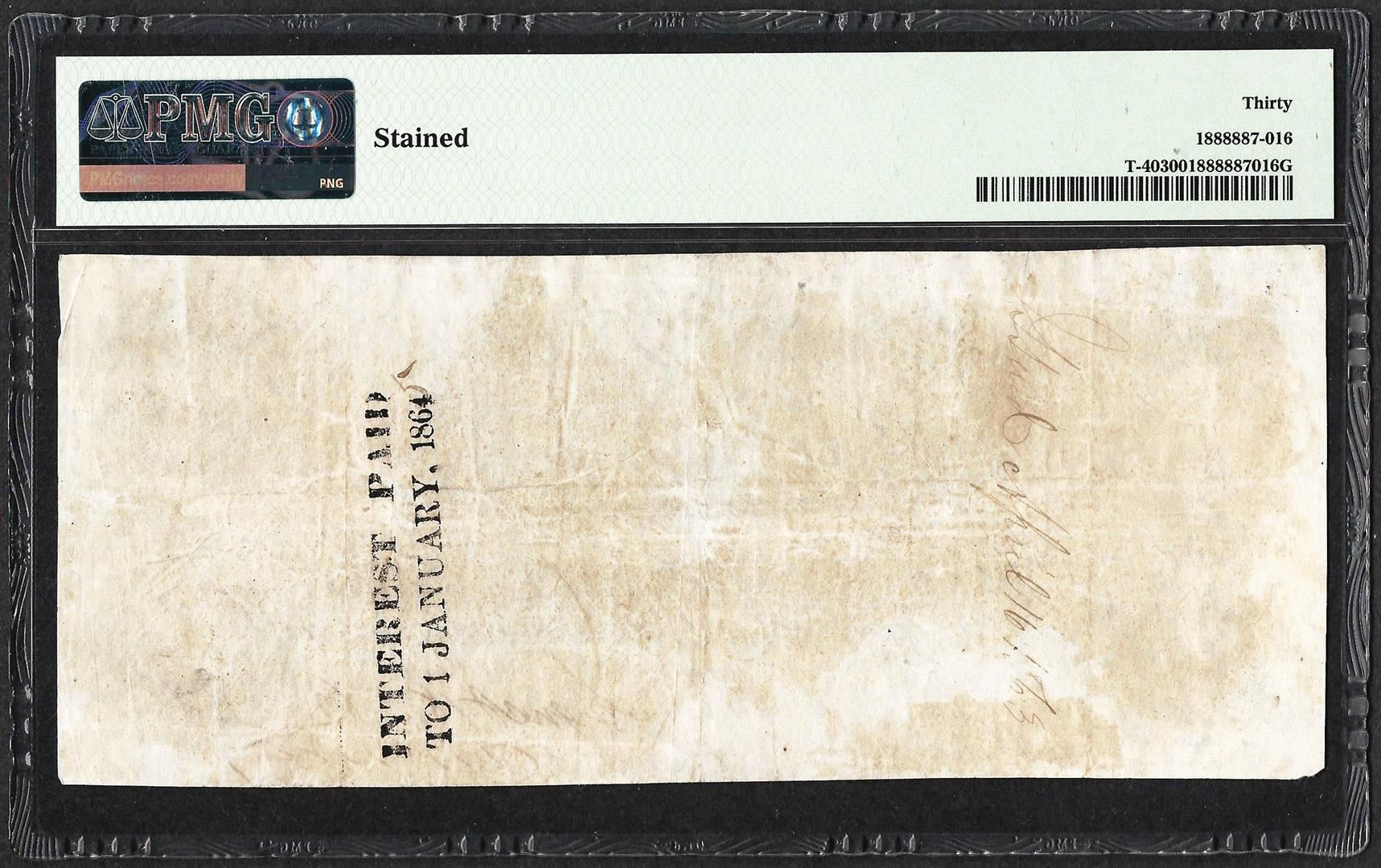 One 1862-63 $100 Confederate States of America Note T-40 PMG Very Fine 30. PMG Certified.