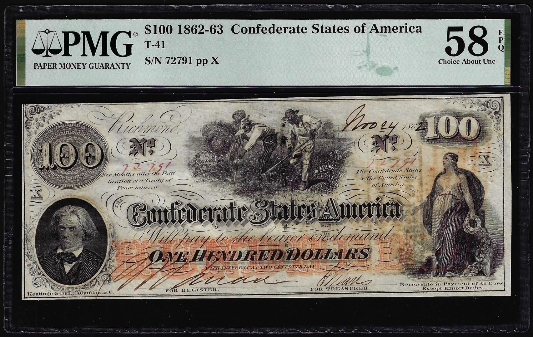 1862-63 $100 Confederate States of America Note T-41 PMG Choice About Unc 58EPQ