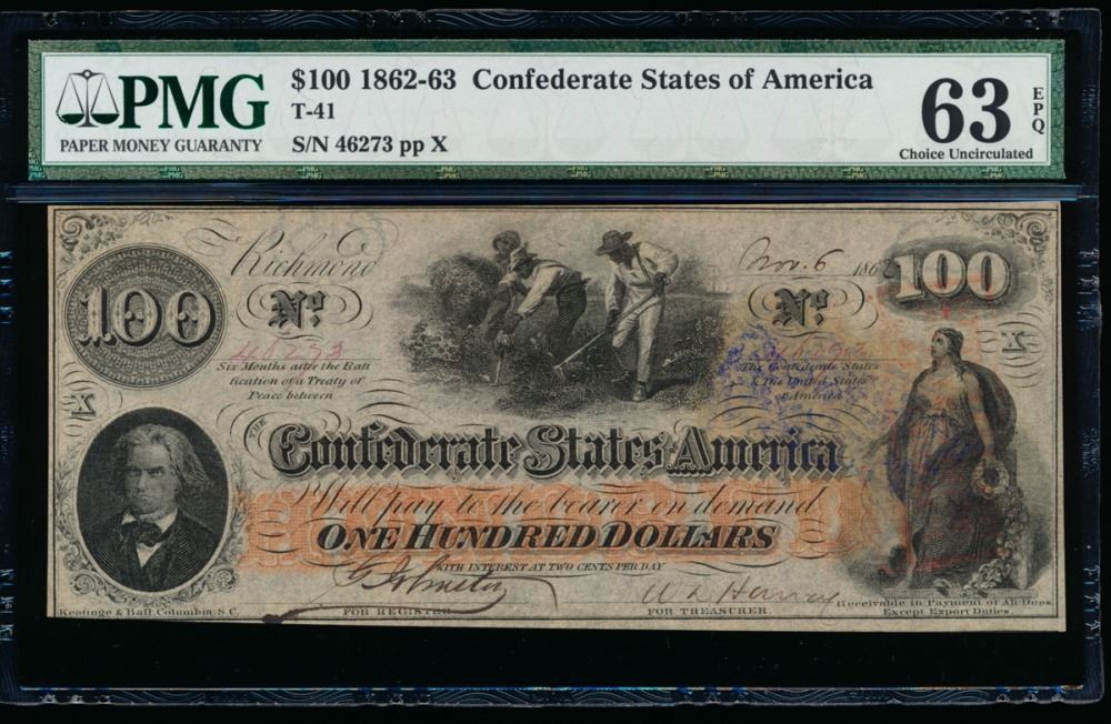 One 1862-63 $100 Confederate States of American Note PMG 63EPQ.
