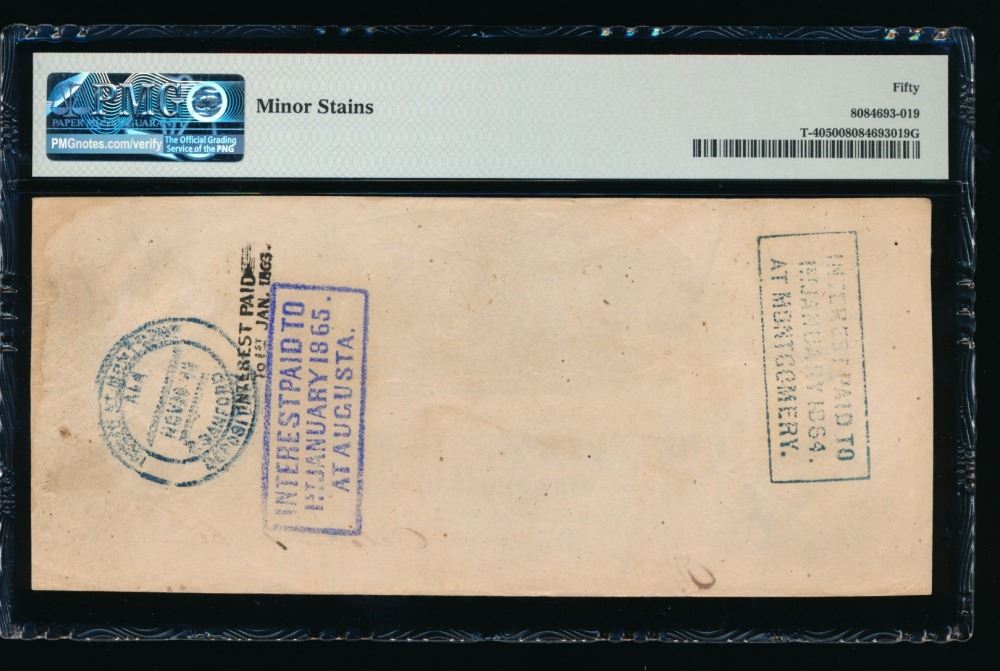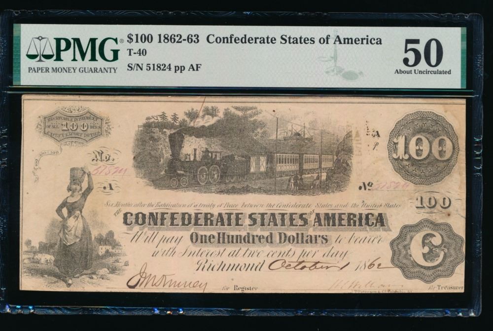 One 1862-63 $100 T-40 Confederate PMG 50.