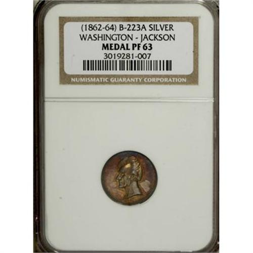 <B>(1862-64) Washington-Jackson Mint Medal PR63 NGC.</B></I> B-223A, Julian PR-29. Silver. A sharply struck specimen with lovely orange-red, violet, and electric-blue patina. The field near Jackson's profile has a few unimportant marks.<BR><BR><b>Shipping:</b> Coins & Currency (<a target="_blank" href="http://www.heritageauctions.com/common/shipping.php">view shipping information</a>)