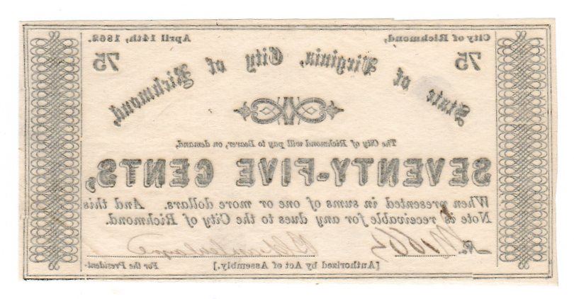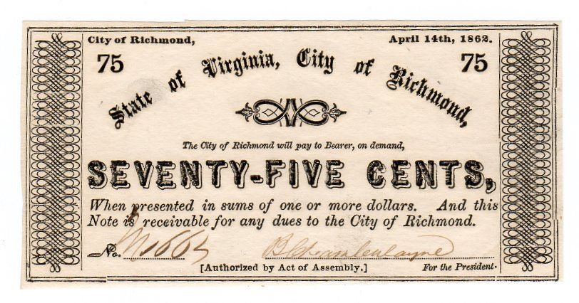One 1862 75 Cents State of Virginia, City of Richmond Note.