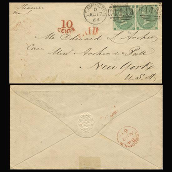 Rare first 1 Shilling issue PAIR; light cancel premium stamps made even rarer by the 10c (US) Postage Due Stamp (stamp shows plate 1, which is a misnomer it is actually plate 2); Gibbons £900BV