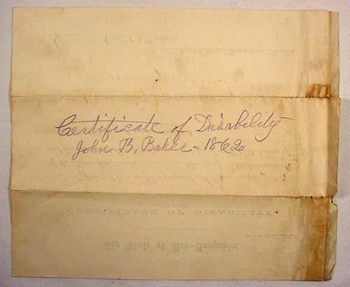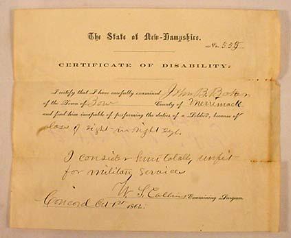 1862 CIVIL WAR ERA CERTIFICATE OF DISABILITY - UNFIT FOR MILITARY DUTY - From State of New Hampshire. Looks like it is for John B. Boker or Boken. Unable to serve due to loss of sight in Right eye