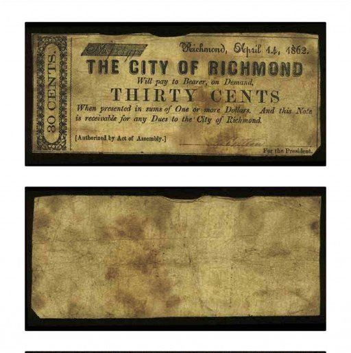 Obsolete Banknote - State of Virginia - City of Richmond - 30¢ - 1862 - Very Good