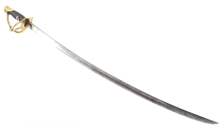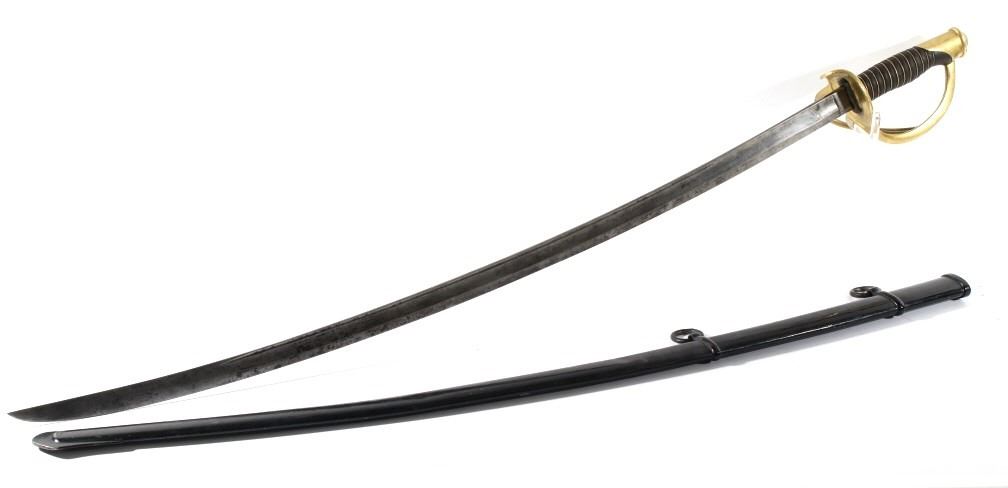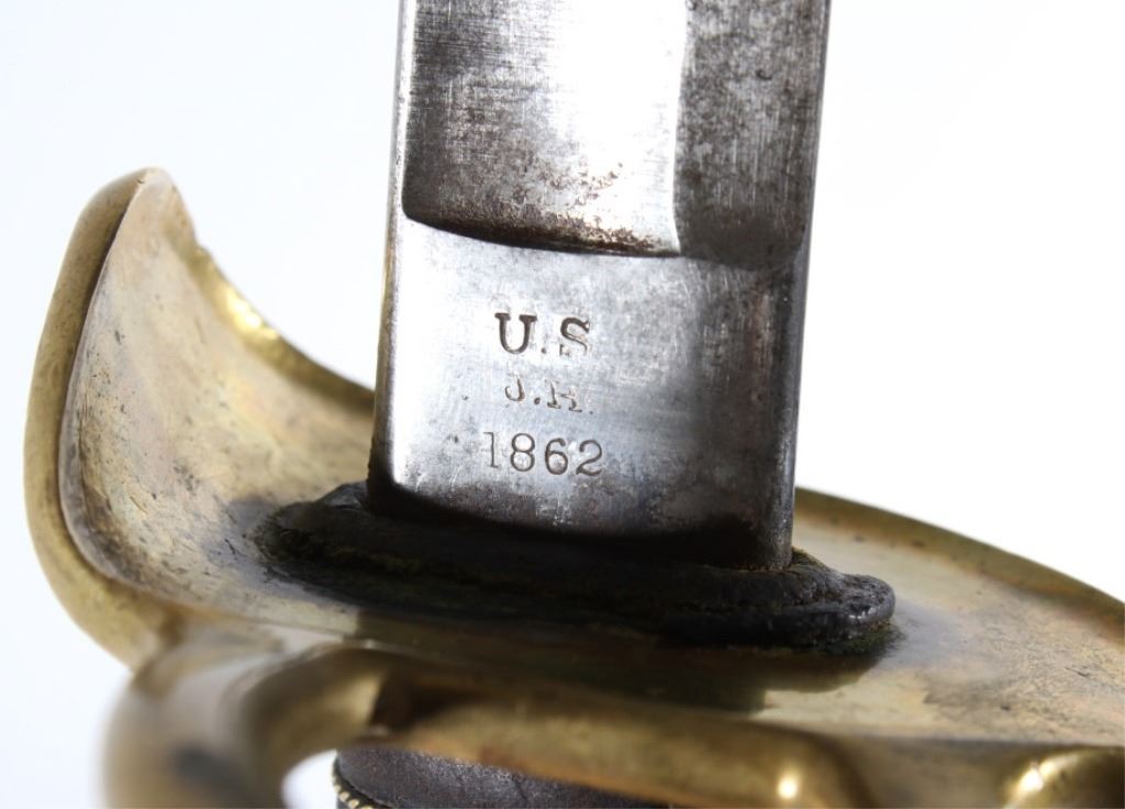 Featured in this lot we have a Civil War U.S. Cavalry saber and metal scabbard originating from 1862. This sword is a model 1862 also known as M1862 and was manufactured by Mansfield & Lamb. The piece shows a steel blade with a solid brass guard and a leather and brass wrapped wood handle. This blade is marked "Mansfield & Lamb Forsetdale. R.I." on one side and U.S. J.H. 1862". across the other. The scabbard shows simple metal construction with two attachment point rings. The sword was used promanately in the American Civil War and replaced out the larger and heavier m1840 cavalry saber. The M1862 was used to outfit light cavalry units as well as officers such as George Armstrong Custer and J.E.B. Stuart. The piece shows good condition overall with some light wear and pitting on the blade and guard indicative of age. The sword measures 41" long with a 35" blade.