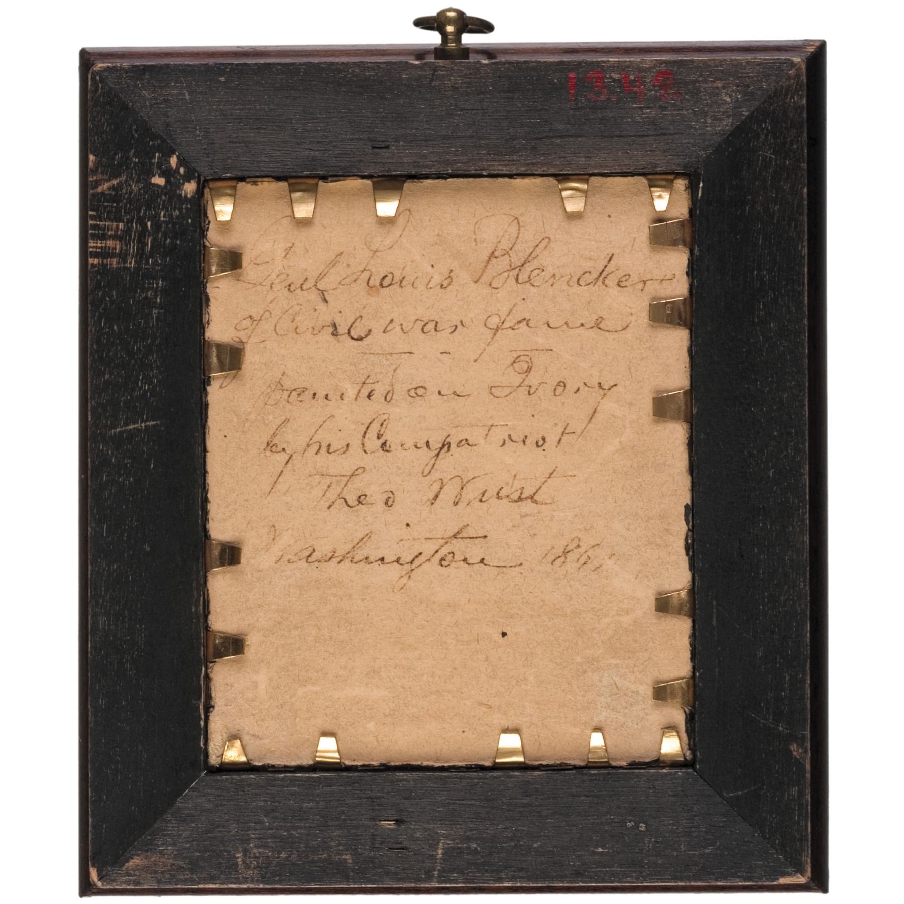 The Miniature Painting measures 3.25” x 2-5/8” being surrounded by a mat, which was popular in the 1860s. The glass is held in place by a gilt metal surround, and the frame is walnut, the overall size being fully to 5.5” x 4.75”. An inscription on the back reads: “Genl Louis Blencker of Civil War fame painted by his Compatriot Theo Wust Washington 1862.” There is a small hanging loop at the top of the frame on this superb display piece.