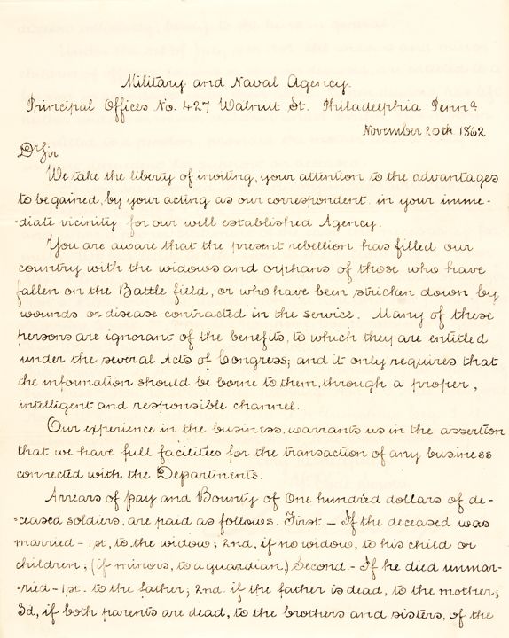“You are aware that the present rebellion has filled our country with the widows and orphans of those who have fallen on the Battle field, or who have been stricken down by wounds or disease contracted in the service. Many of those persons are ignorant of the benefits, to which they are entitled under the several Acts of Congress; and it only requires that the information should be borne to them through a proper, intelligent and responsible channel.... Arrears of pay and Bounty of One hundred dollars of deceased soldiers, are paid as follows... If you are disposed to act in conjunction with us, we will cheerfully afford you every information in our power...”