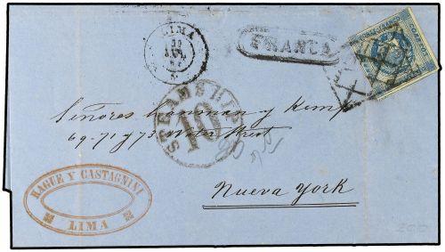 1862 Entire to New York franked imperf 1 dinero tied boxed net cancel with Lima cds in association. Obverse also bears oval-framed "Franca" + U.S. "Steamship 10" arrival handstamp.