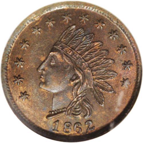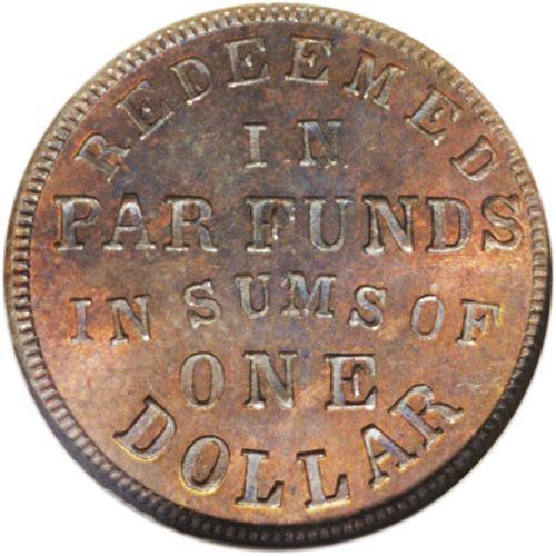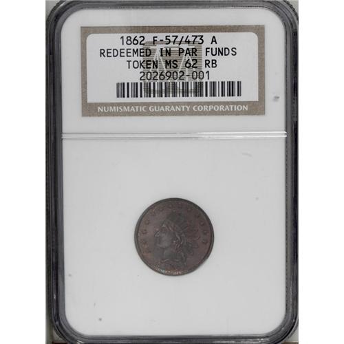 <B>1862 Redeemed in Par Funds, Fuld-57/473A, R.7, MS62 Red and Brown NGC.</B></I> This very scarce 1862-dated Civil War token has an obverse featuring a Native American, with 13 stars above and the date below. The reverse features the caption REDEEMED IN PAR FUNDS IN SUMS OF ONE DOLLAR, a princely sum of money during the Civil War. . Both dies on this token rarely used on patriotic tokens. The current catalog value in MS60 is $1,000. This token exhibits blue toning over semiglossy surfaces. This would make for a great addition to a patriotic Civil War token collection.<BR><I>From The Troy Wiseman Collection.</B></I>