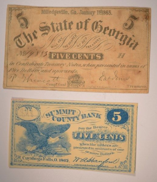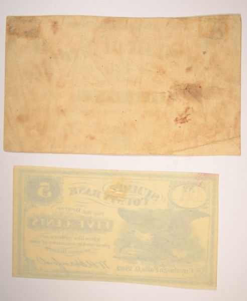 1862 FIVE CENT SUMMIT BANK NOTE CUYAHOGA FALLS, OH & 1863 FIVE CENT STATE OF