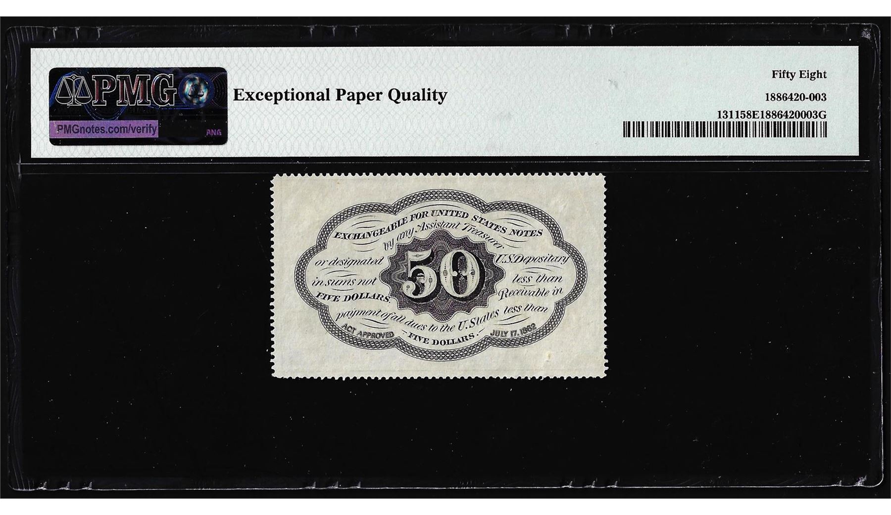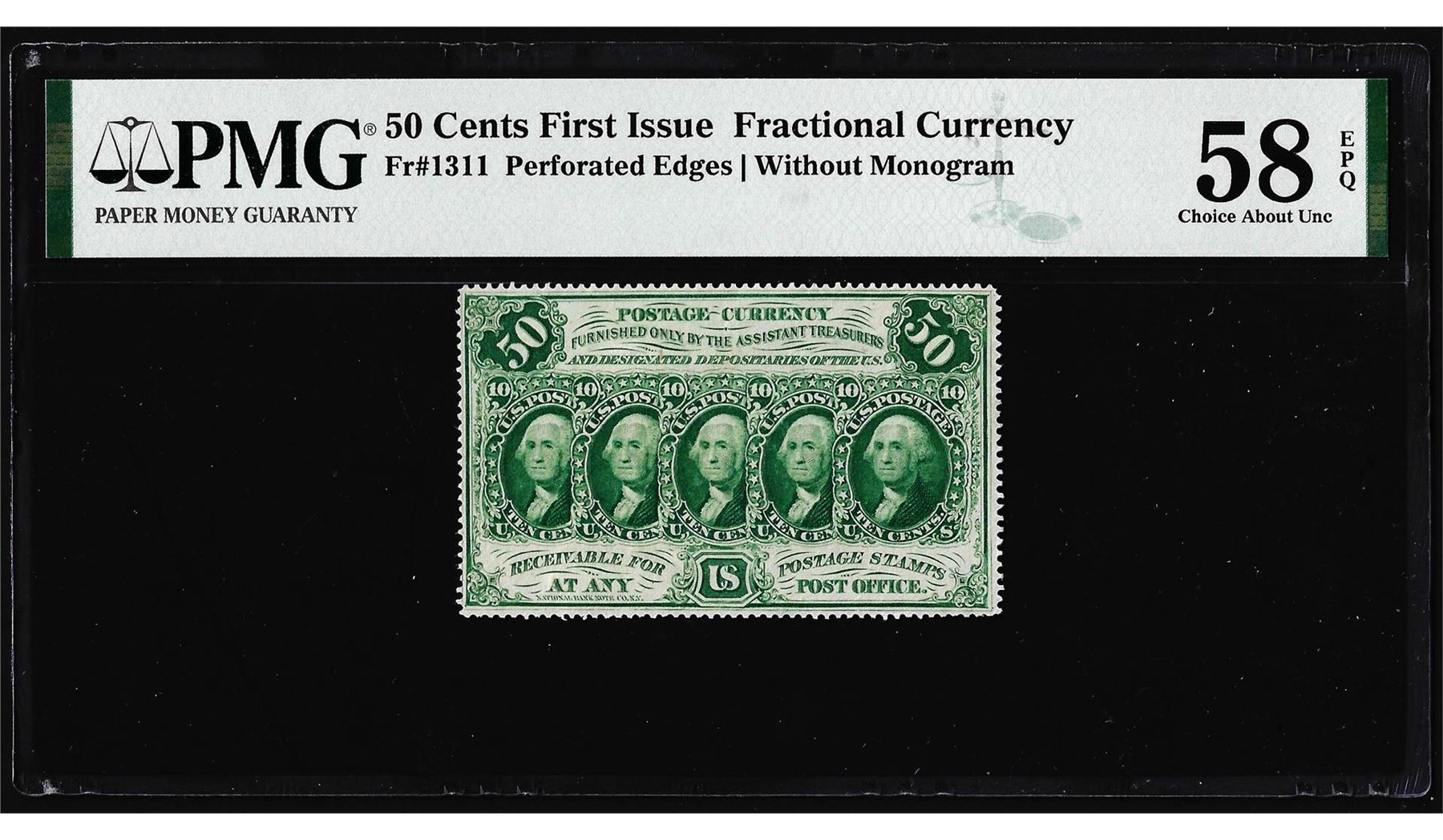 One 1862 Fifty Cent First Issue Fractional Note Fr.1311 PMG Ch. About Uncirculated 58EPQ. PMG Certified.