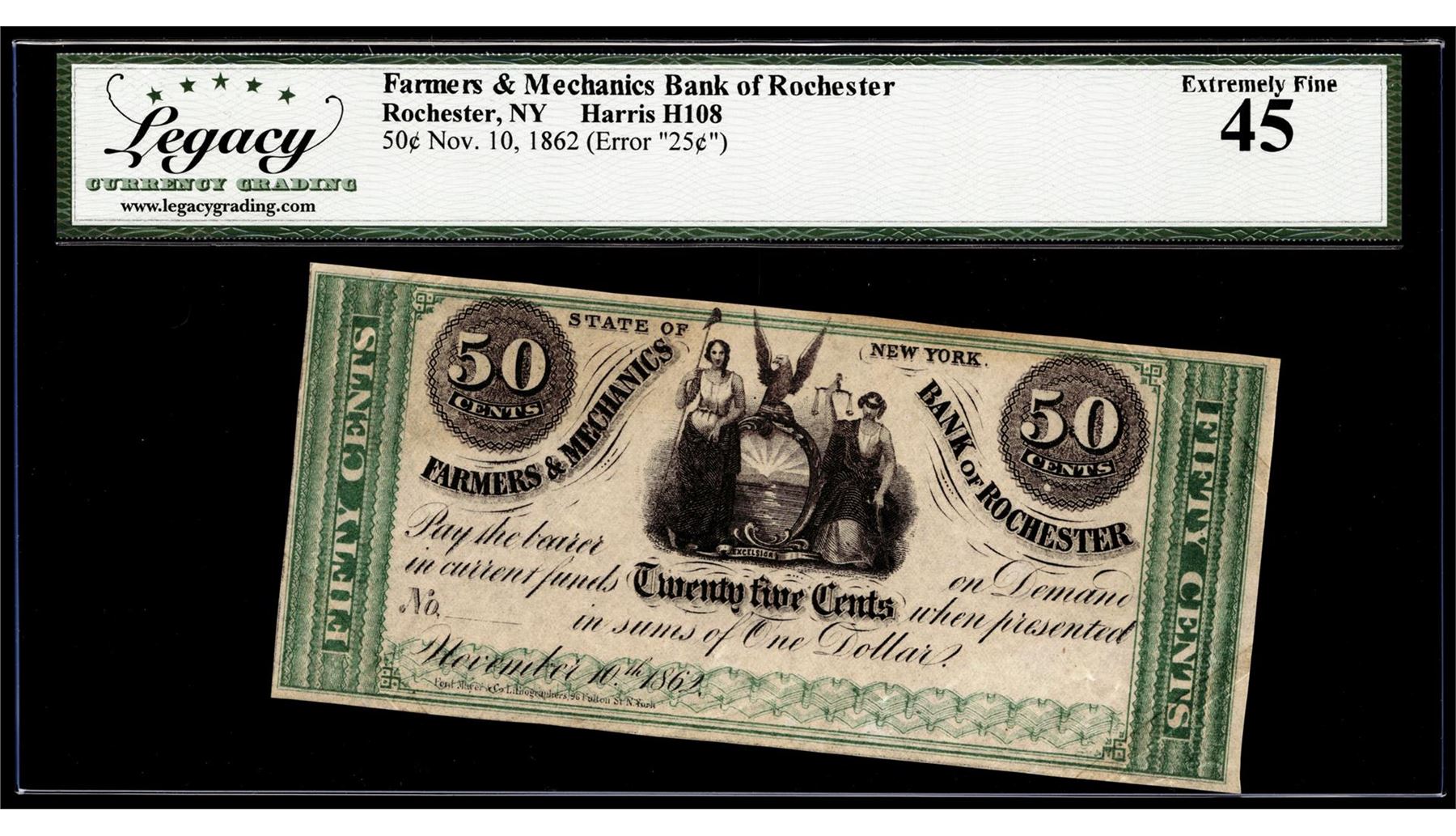 1862 Fifty Cents Farmers & Mechanics Bank of Rochester, NY Obsolete Note Legacy XF45