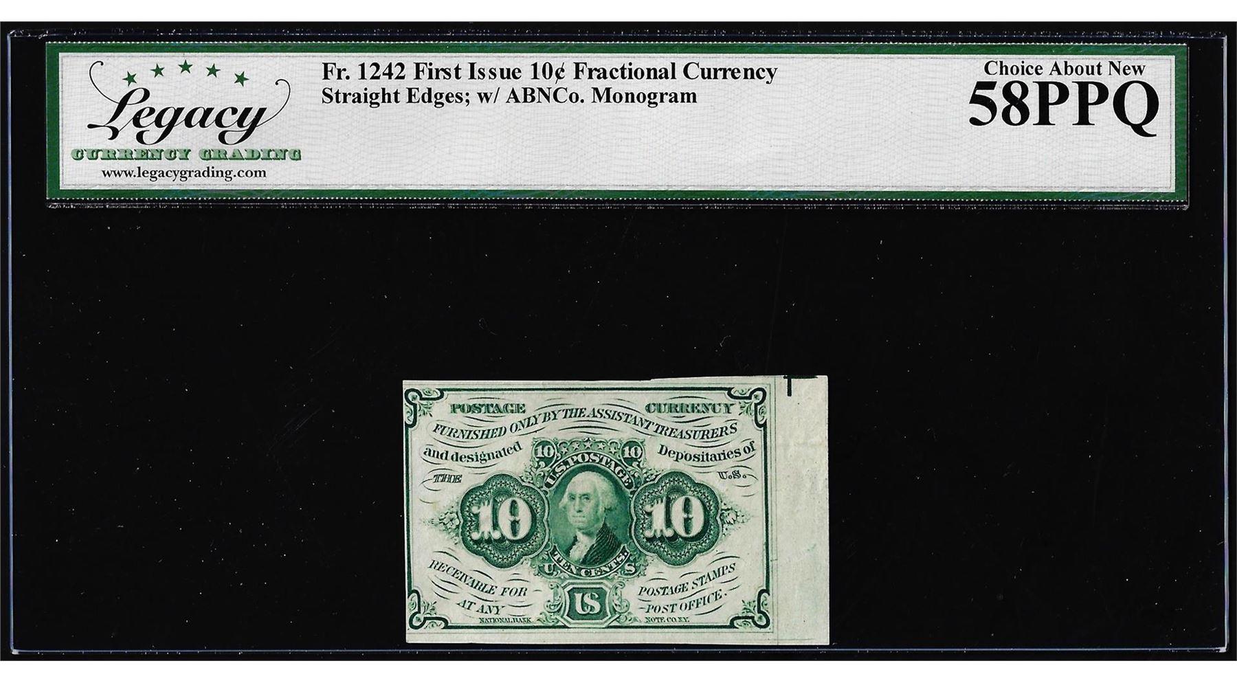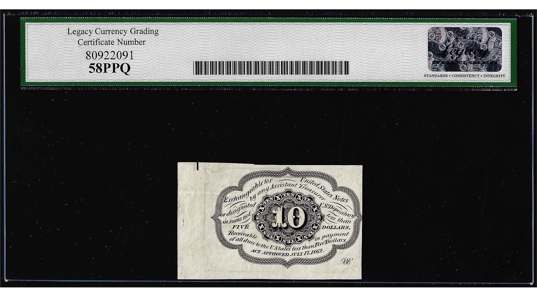 One 1862 First Issue 10 Cent Fractional Currency Note Fr.1242 Legacy Choice About New 58PPQ. Legacy Graded.