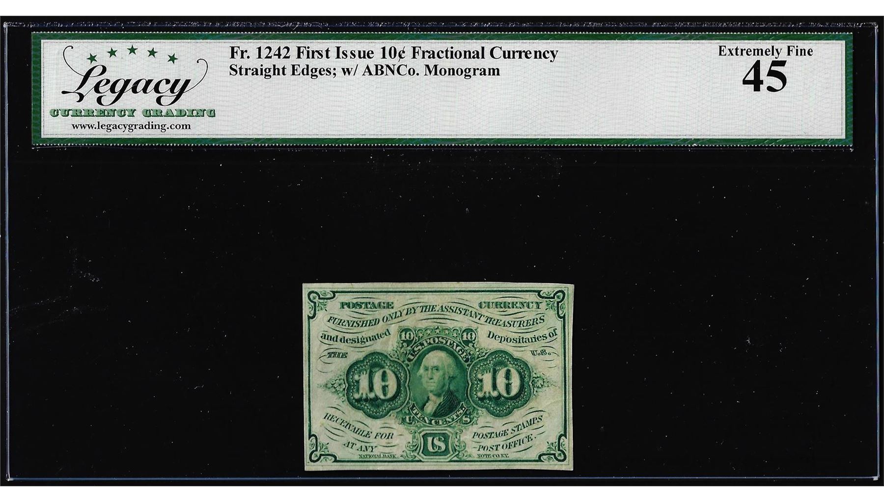 One 1862 First Issue 10 Cent Fractional Currency Note Fr.1242 Legacy Extremely Fine 45. Legacy Graded.
