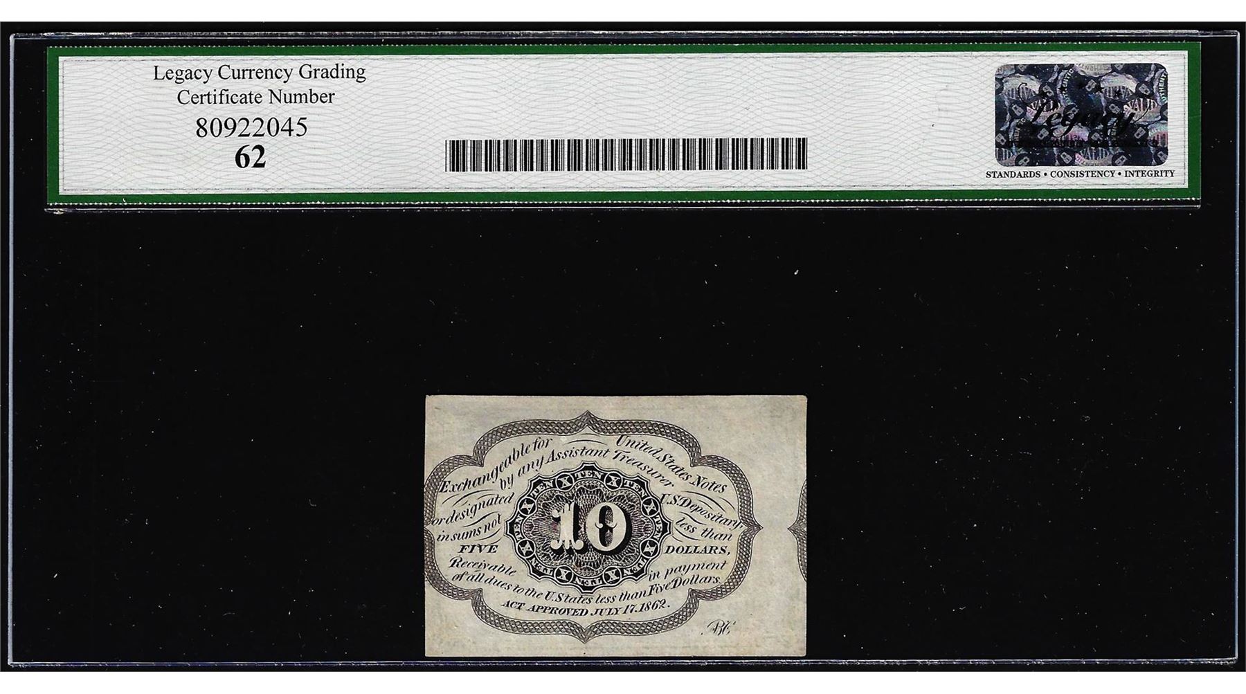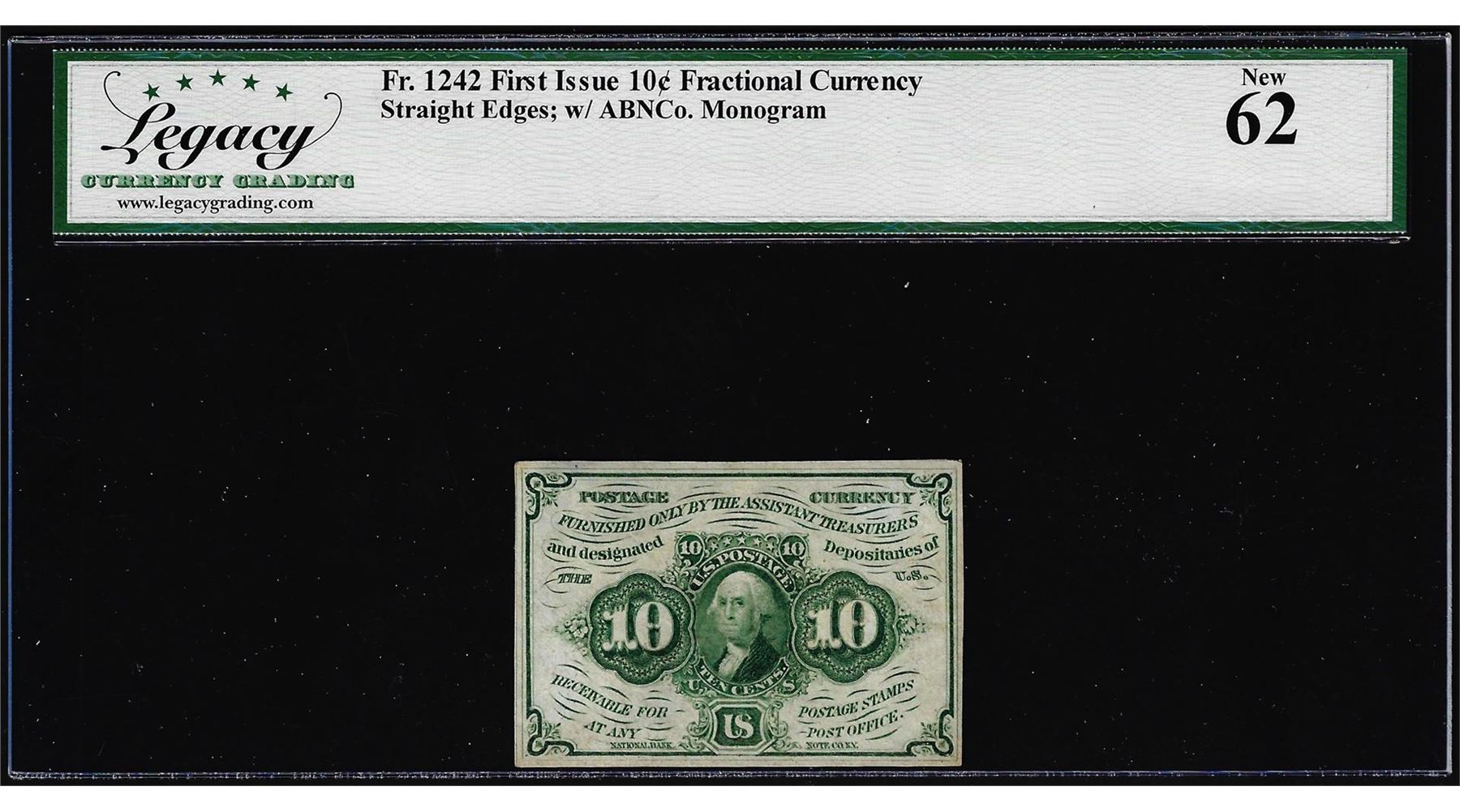 One 1862 First Issue 10 Cent Fractional Currency Note Fr.1242 Legacy New 62. Legacy Graded.