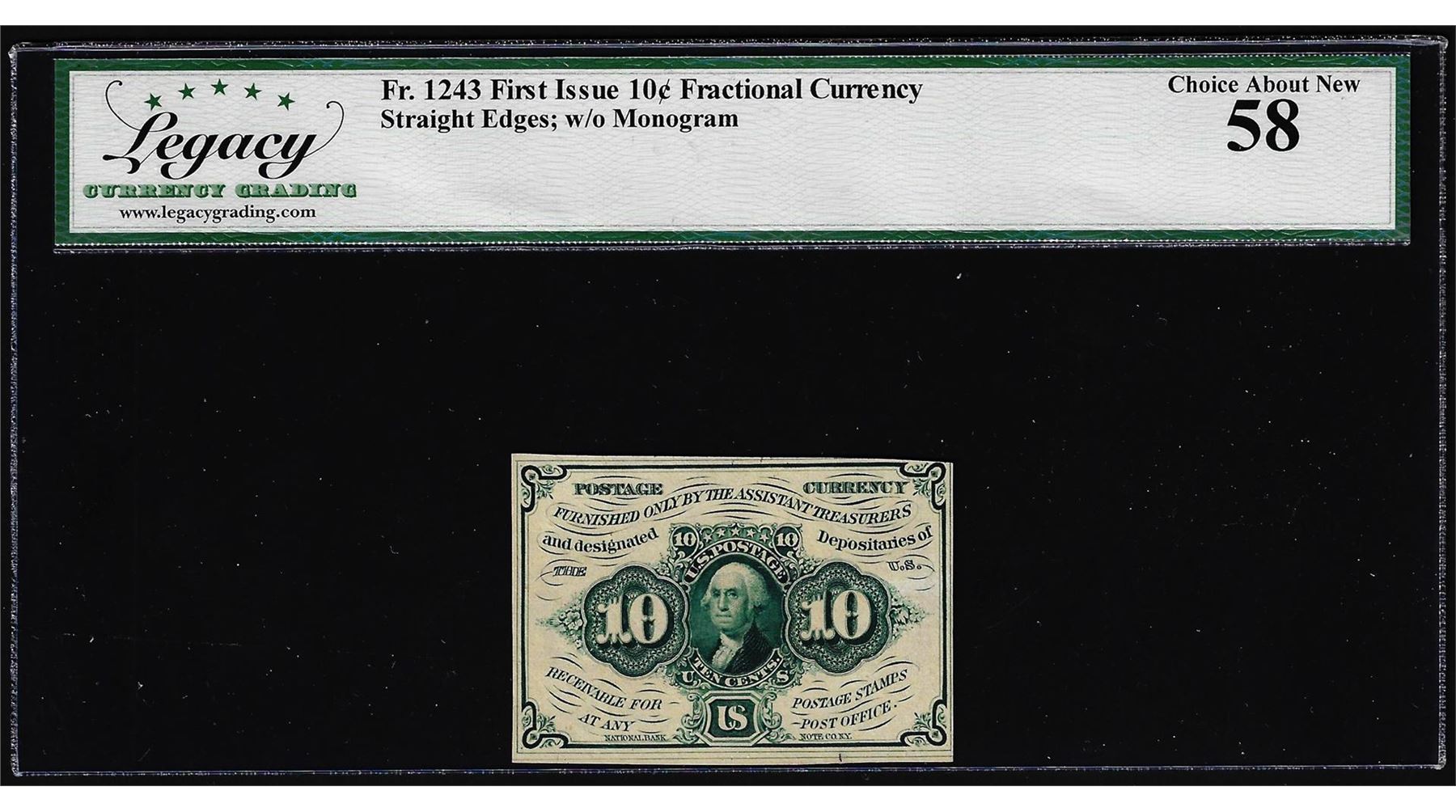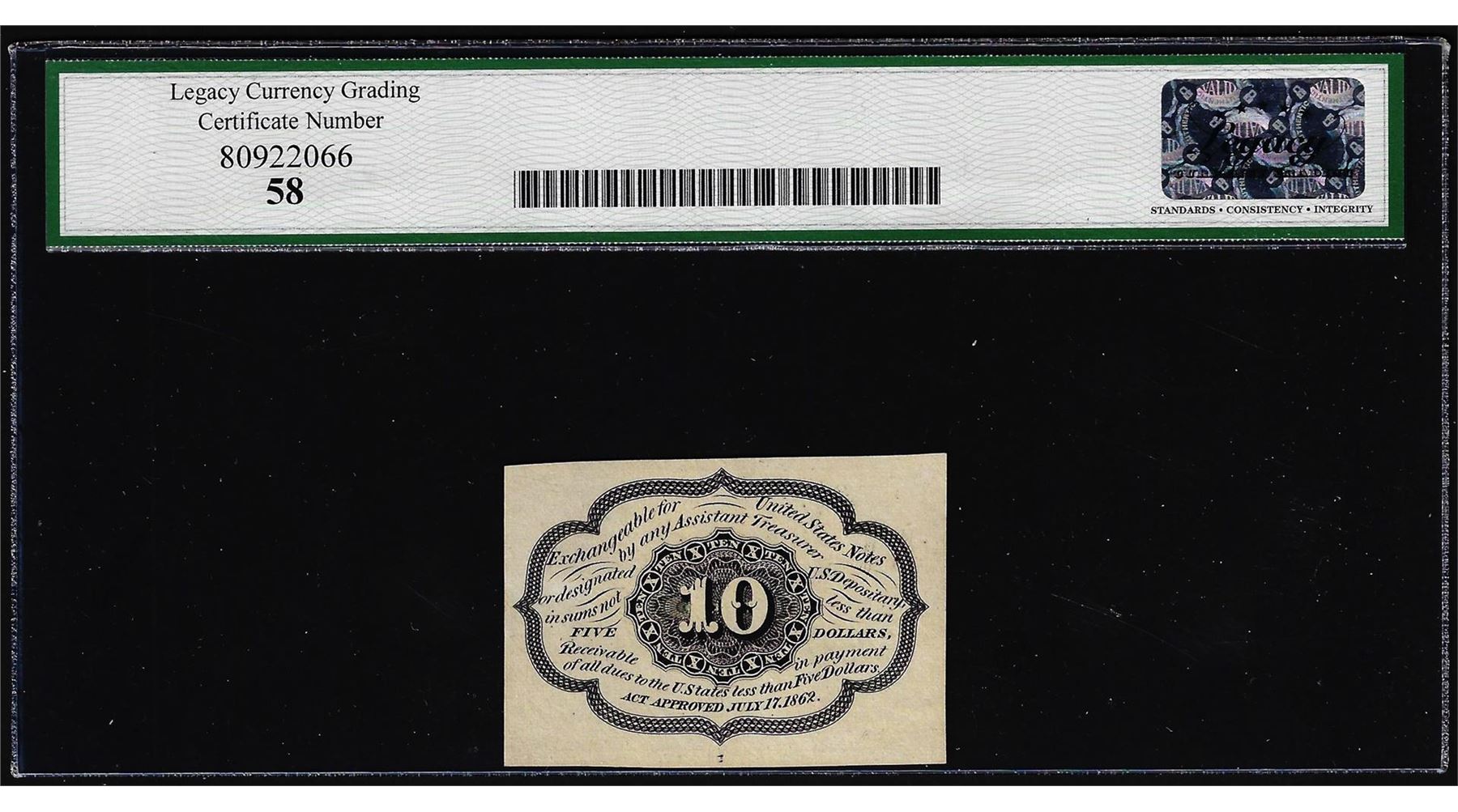 One 1862 First Issue 10 Cent Fractional Currency Note Fr.1243 Legacy Choice About New 58. Legacy Graded.