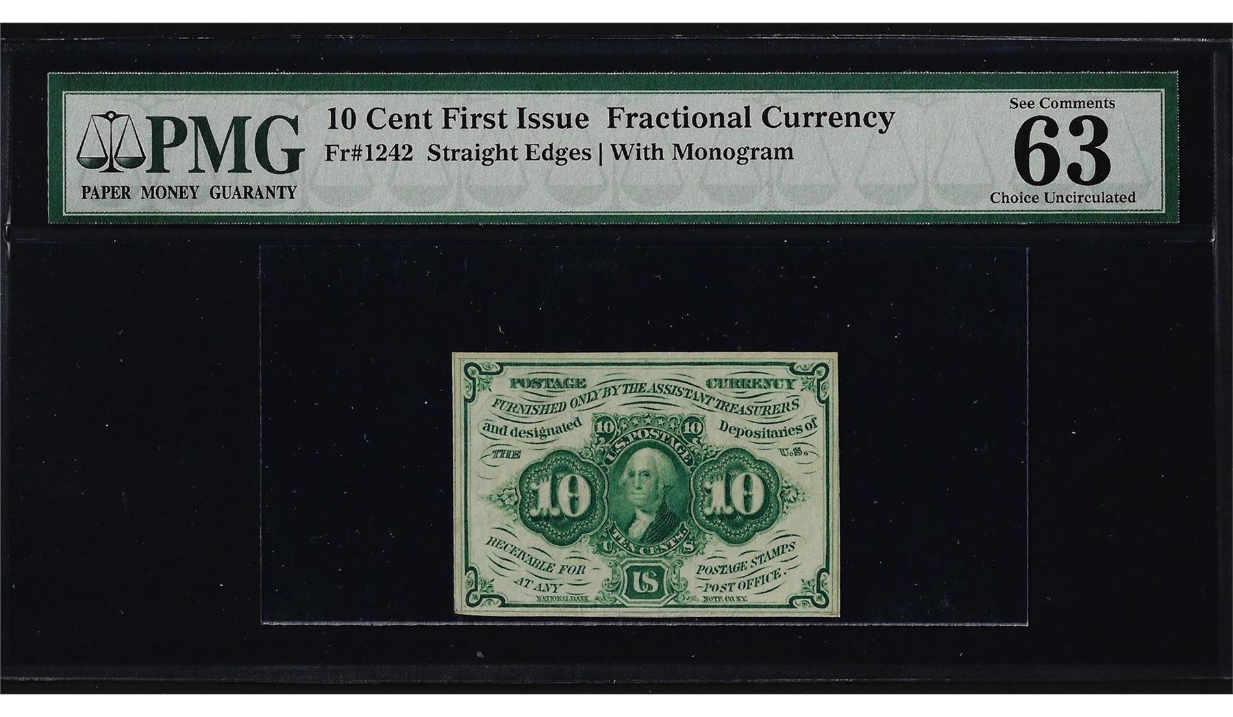 One 1862 First Issue 10 Cent Fractional Currency Note PMG Choice Uncirculated 63EPQ. PMG Certified.
