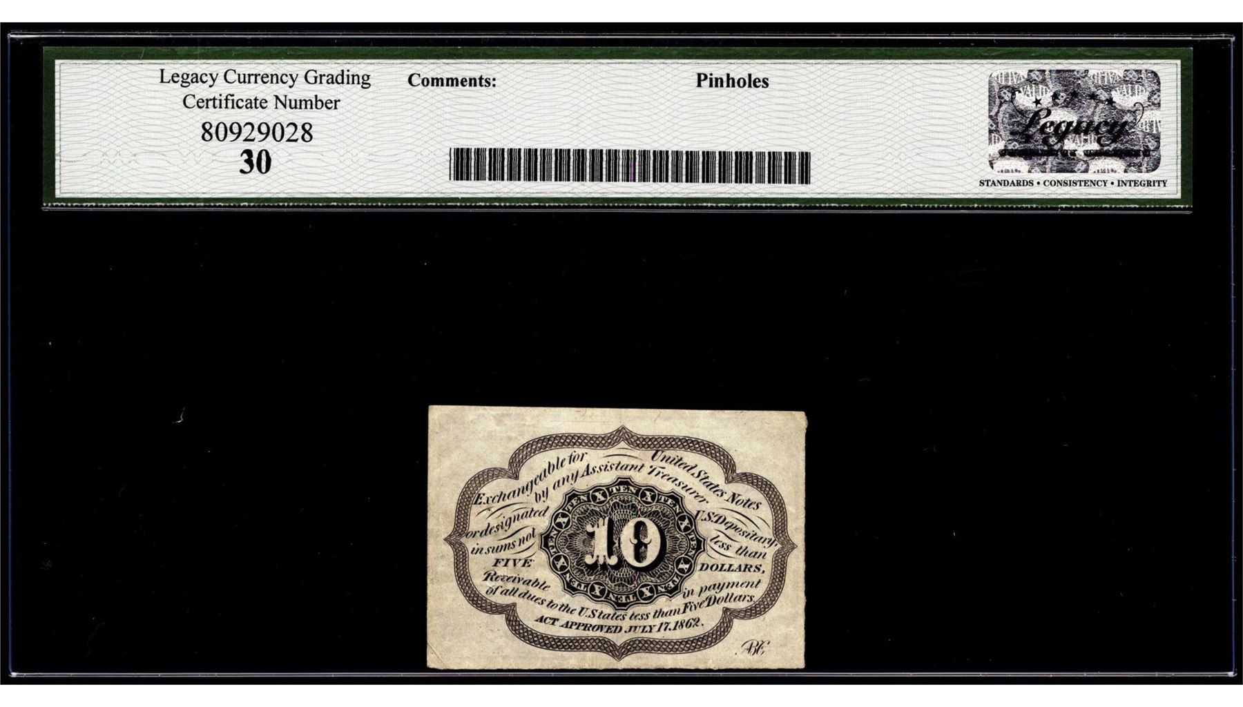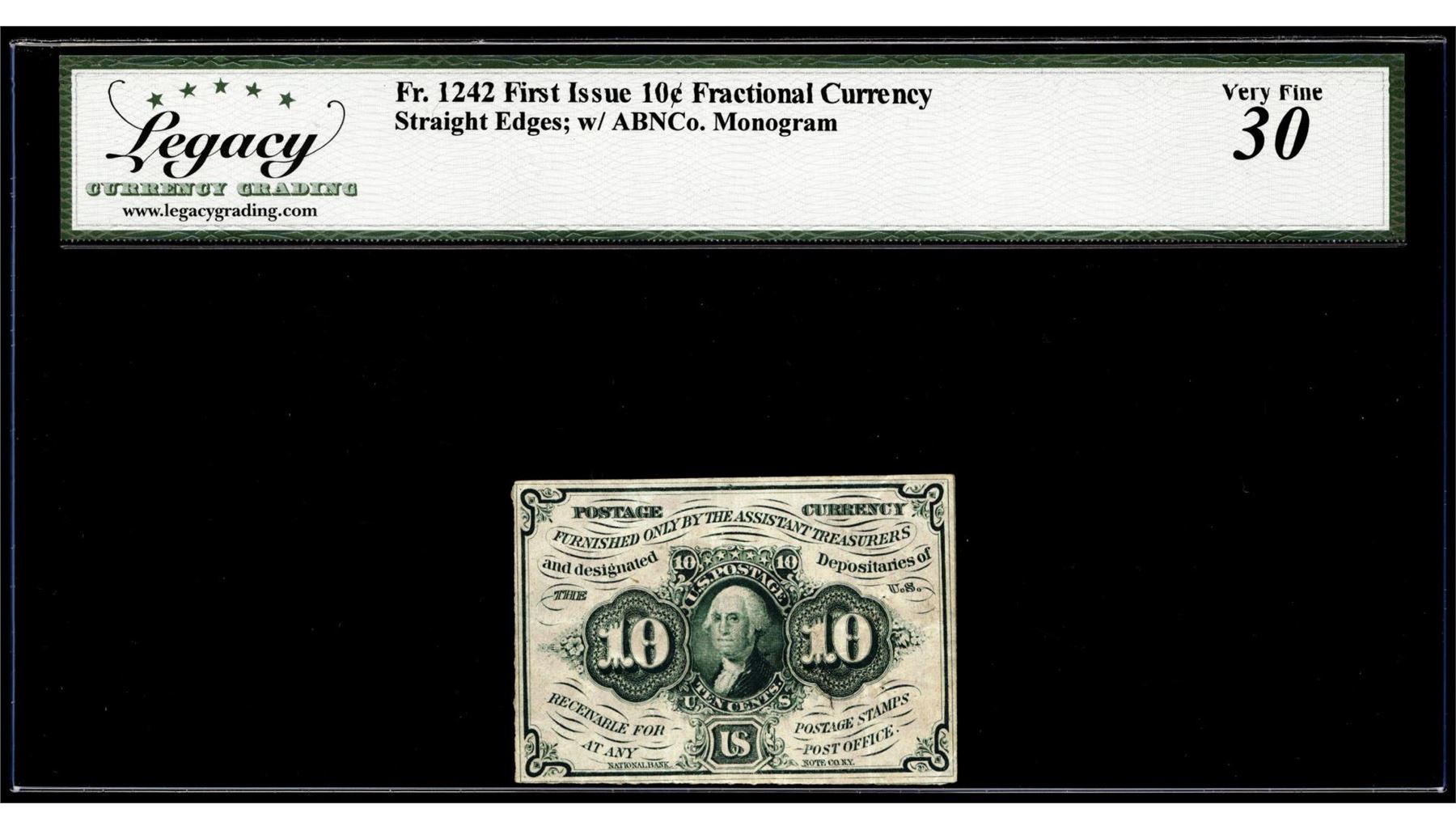 One 1862 First Issue 10 Cents Fractional Currency Note Fr.1242 Legacy Very Fine 30. Legacy Graded.