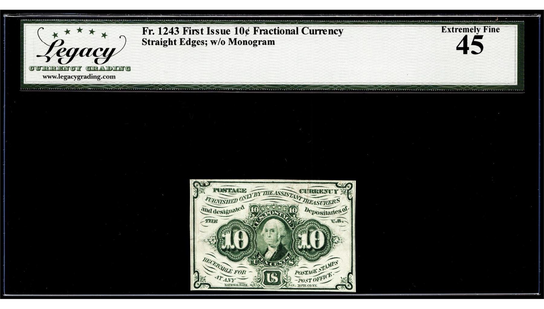 One 1862 First Issue 10 Cents Fractional Currency Note Fr.1243 Legacy Extremely Fine 45. Legacy Graded.
