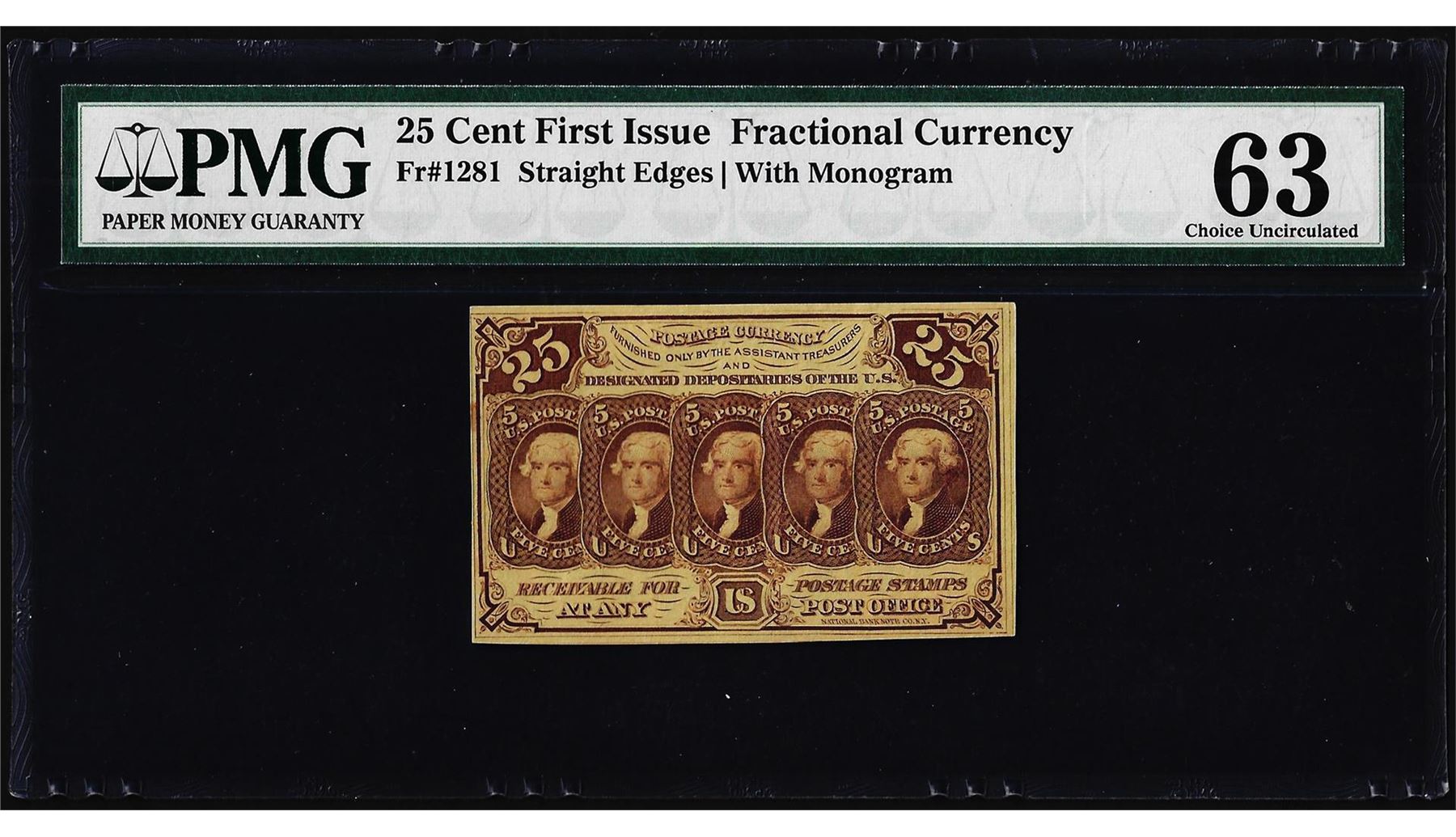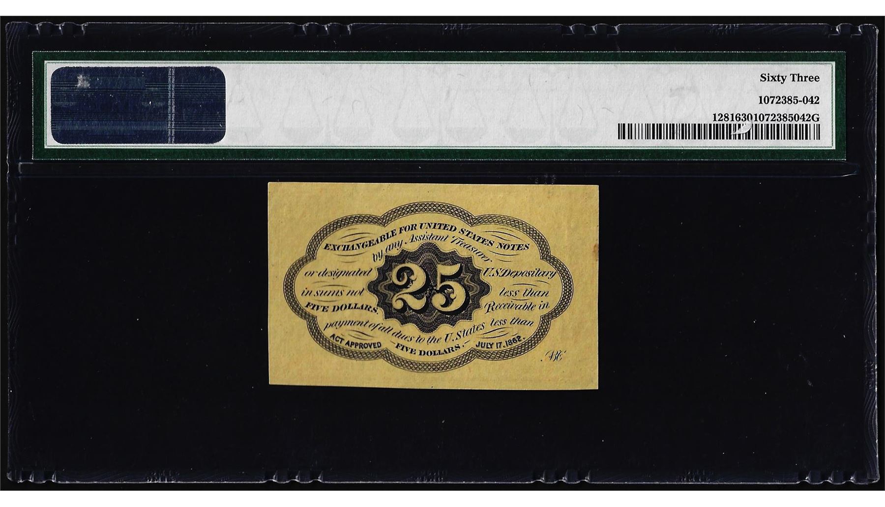 One 1862 First Issue 25 Cent Fractional Currency Note Fr.1281 PMG Choice Uncirculated 63. PMG Certified.