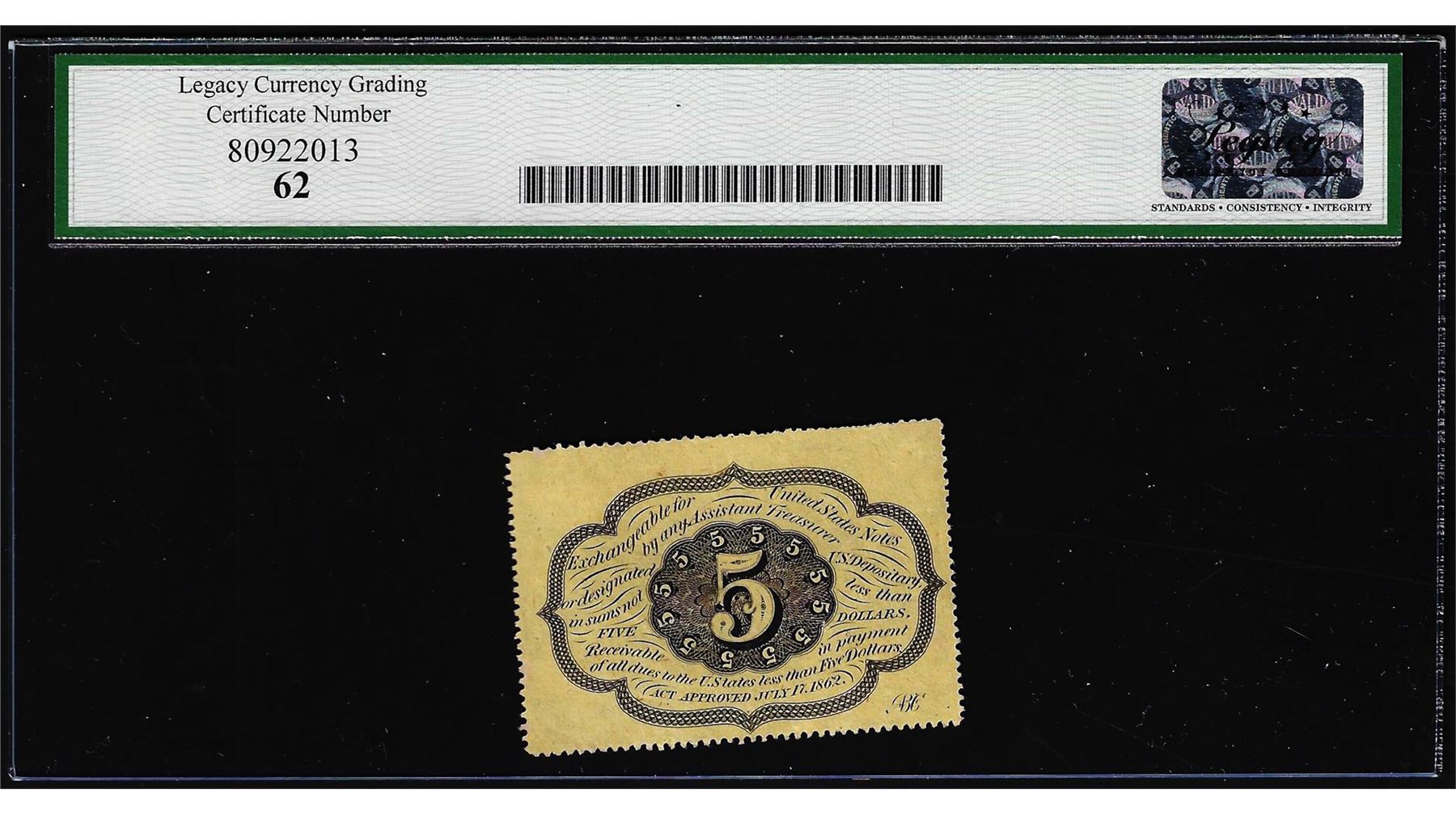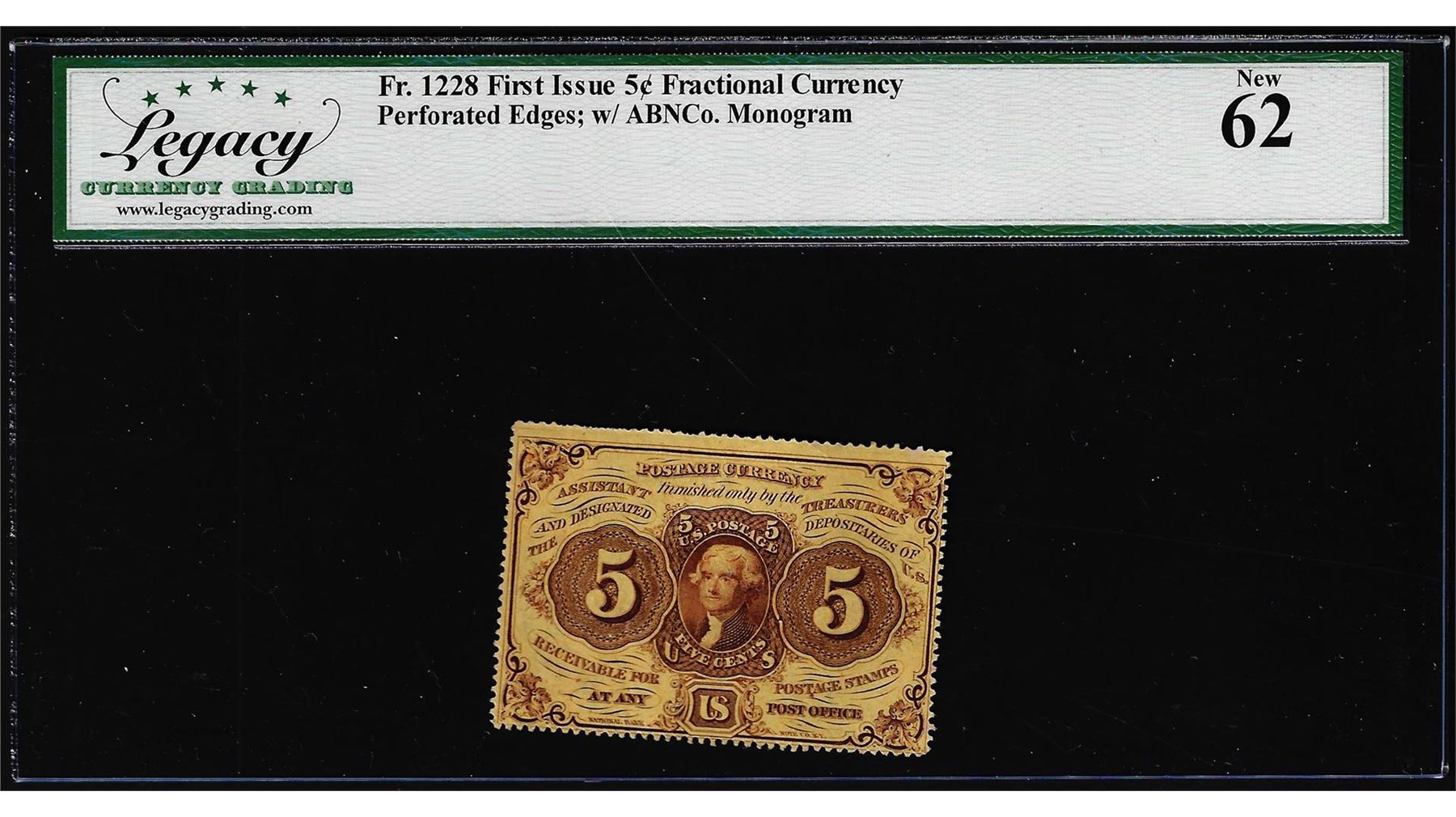 One 1862 First Issue 5 Cent Fractional Currency Note Fr.1228 Legacy New 62. Legacy Graded.