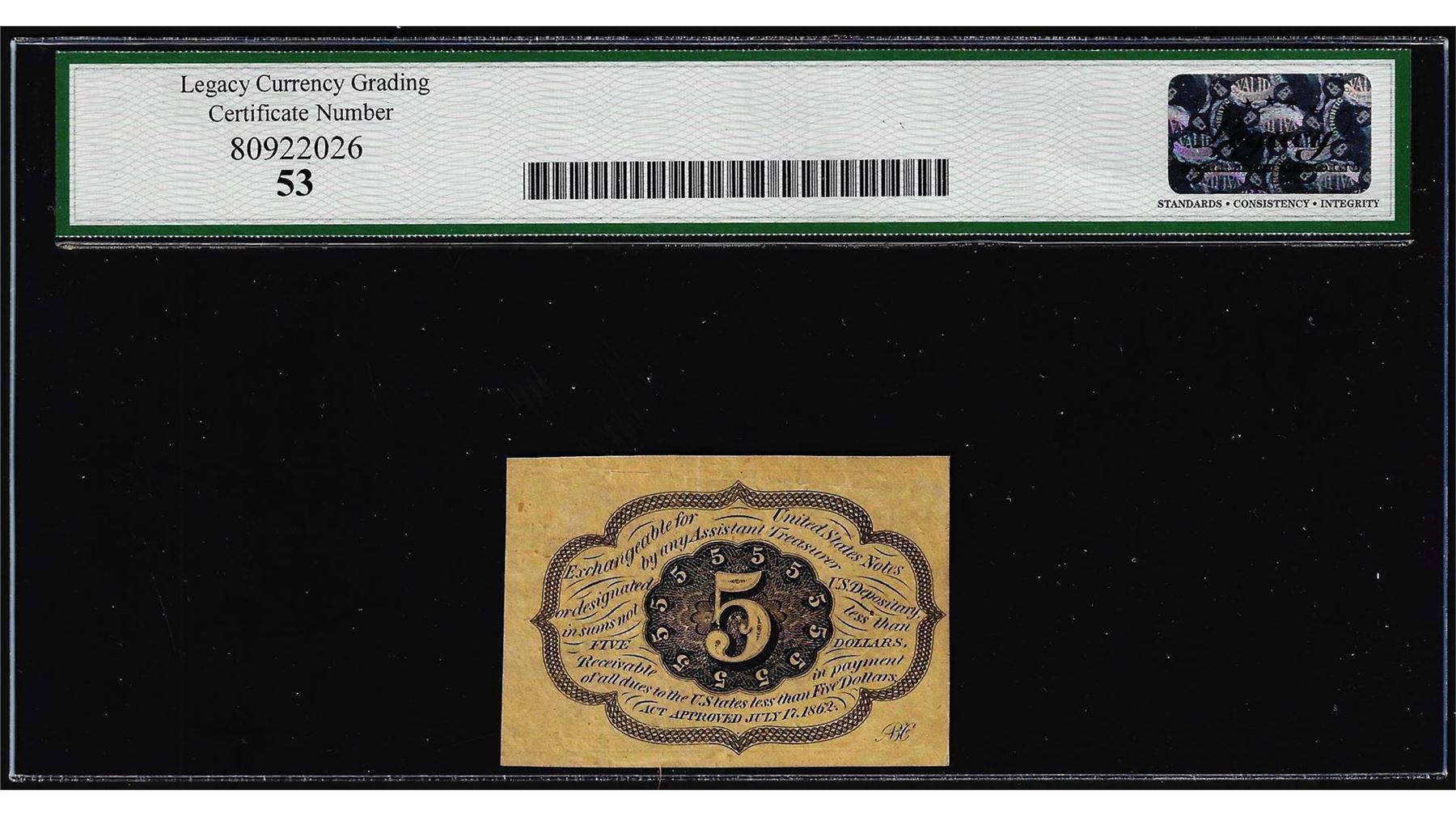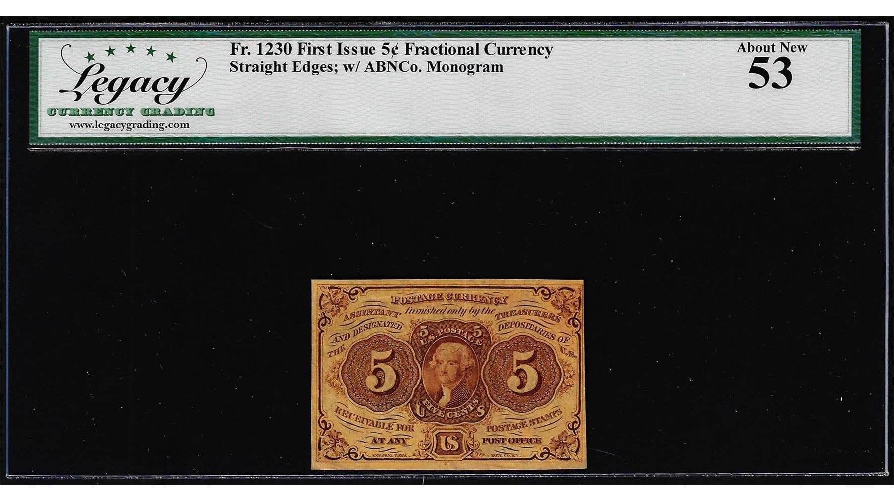 One 1862 First Issue 5 Cent Fractional Currency Note Fr.1230 Legacy About New 53. Legacy Graded.