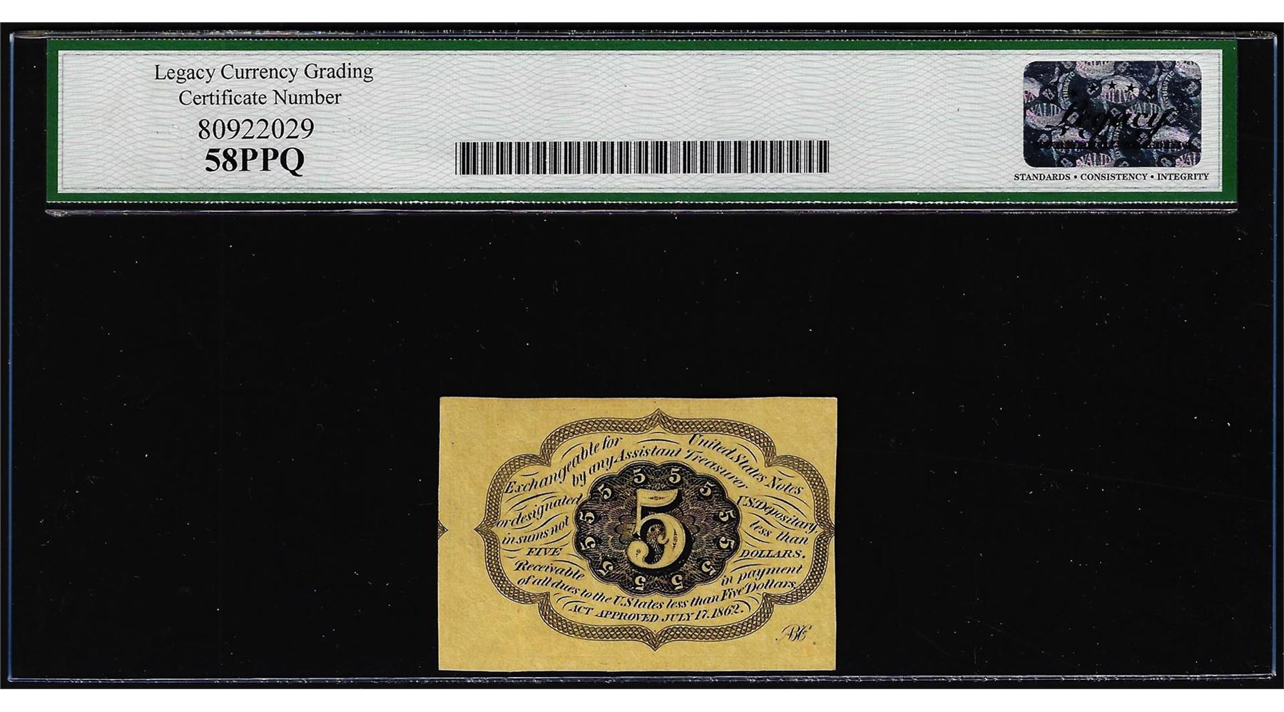 One 1862 First Issue 5 Cent Fractional Currency Note Fr.1230 Legacy Choice About New 58PPQ. Legacy Graded.