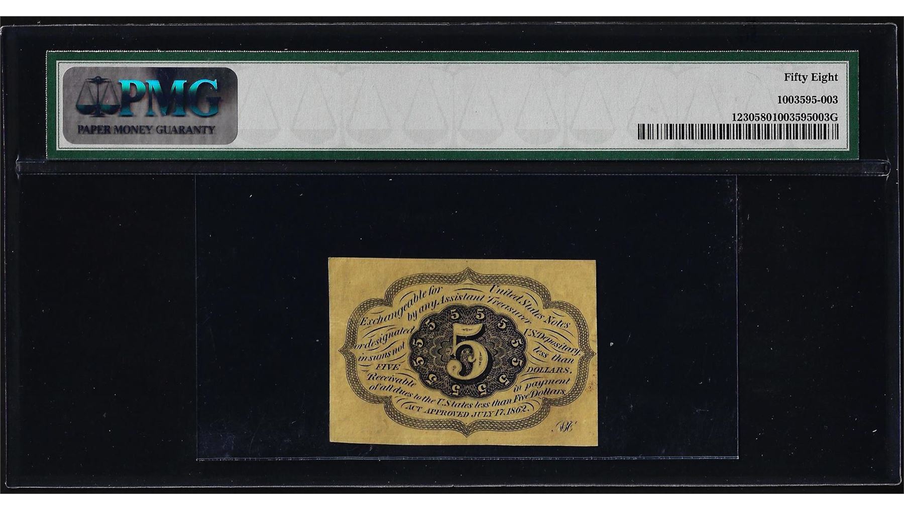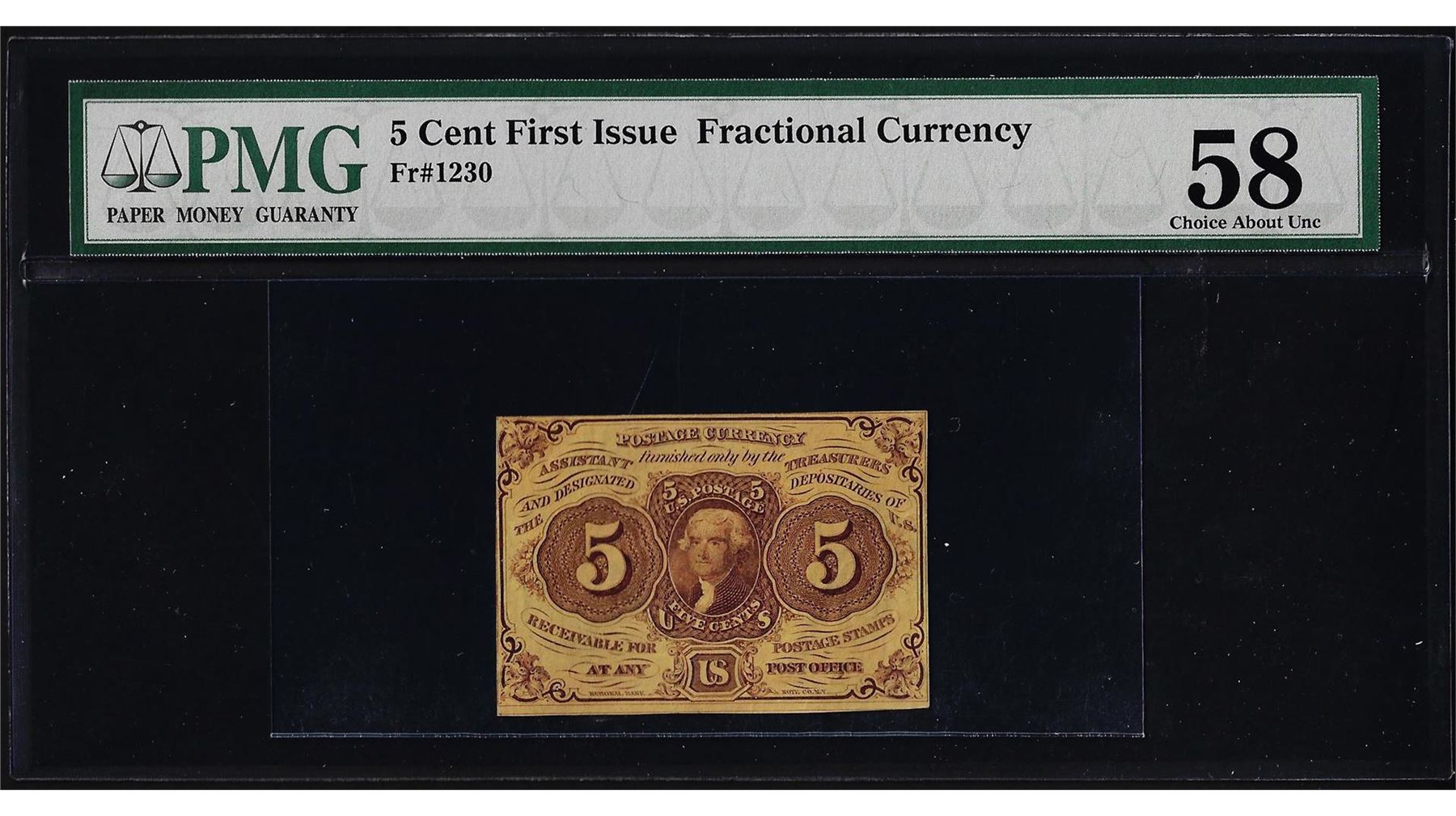 One 1862 First Issue 5 Cent Fractional Currency Note PMG Choice About Uncirculated 58. PMG Certified.