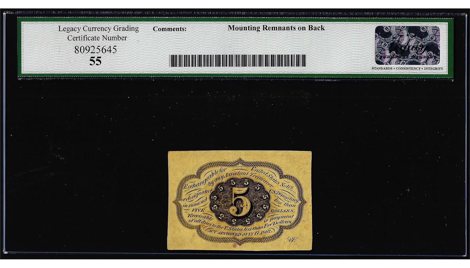 One 1862 First Issue 5 Cents Fractional Currency Note Fr.1230 Legacy Choice About New 55. Legacy Graded.