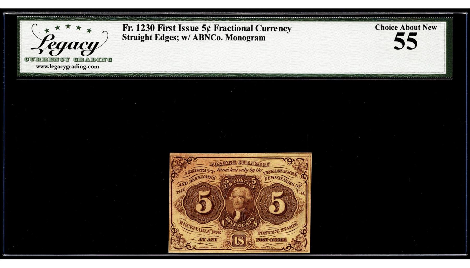 One 1862 First Issue 5 Cents Fractional Currency Note Fr.1230 Legacy Choice About New 55. Legacy Graded.
