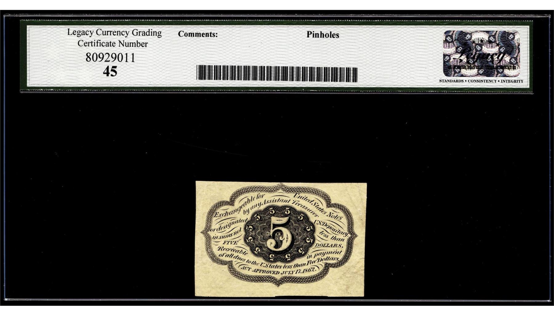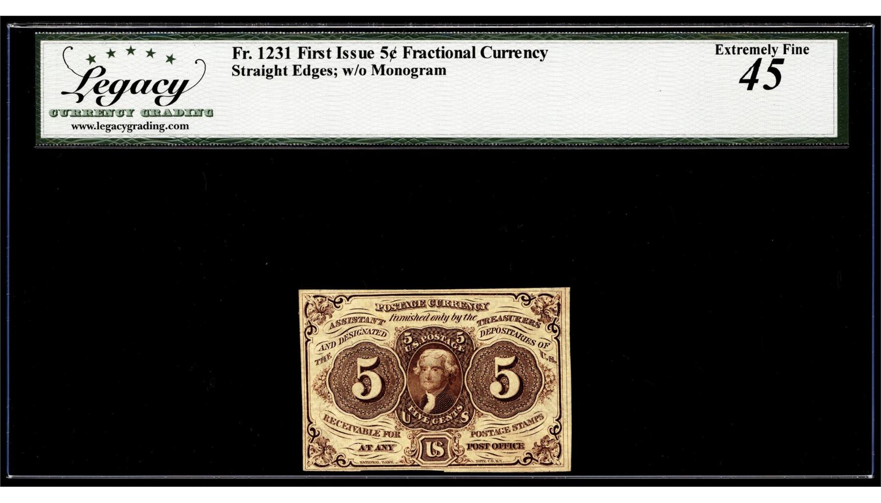 One 1862 First Issue 5 Cents Fractional Currency Note Fr.1231 Extremely Fine 45. Legacy Graded.