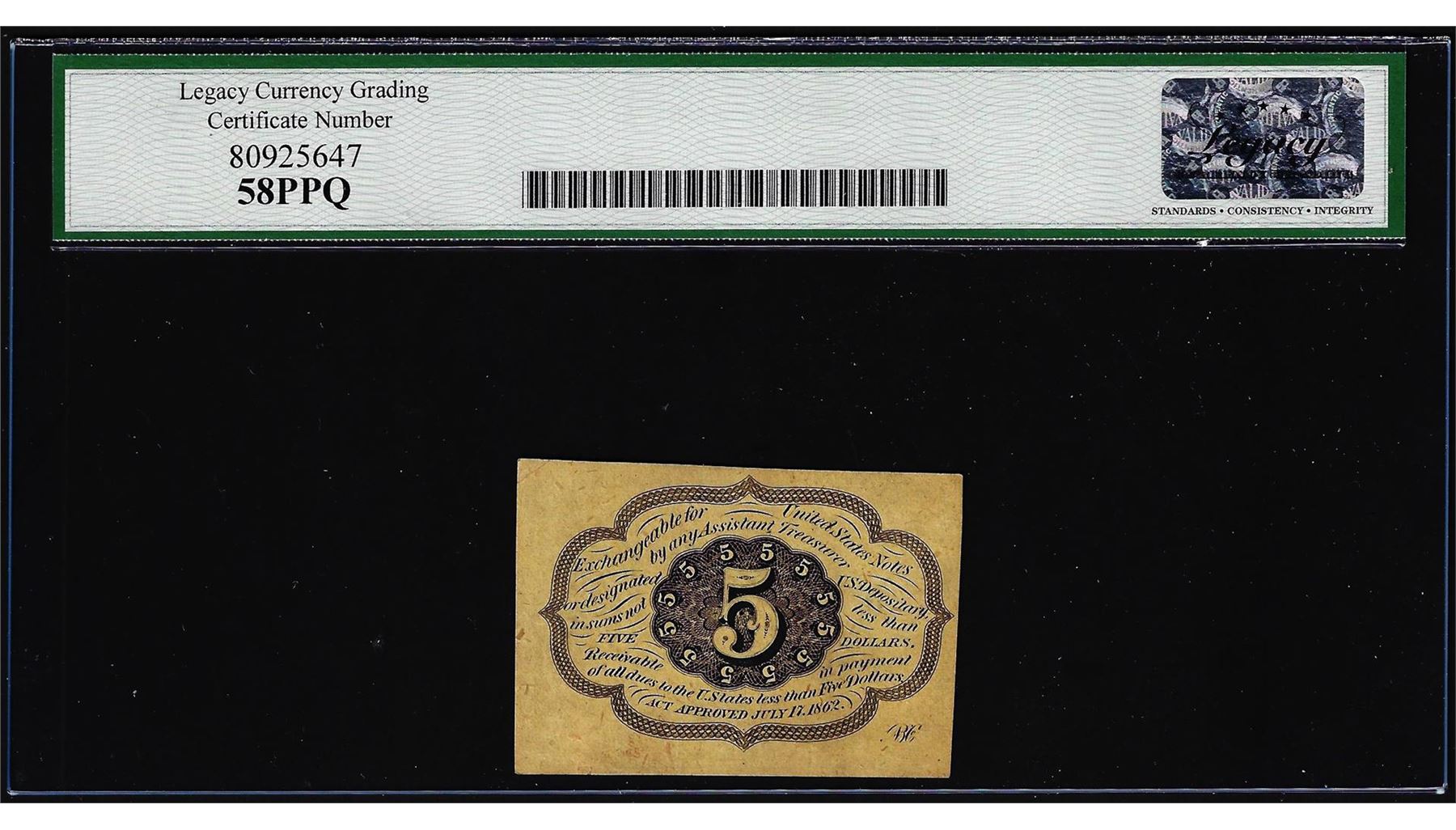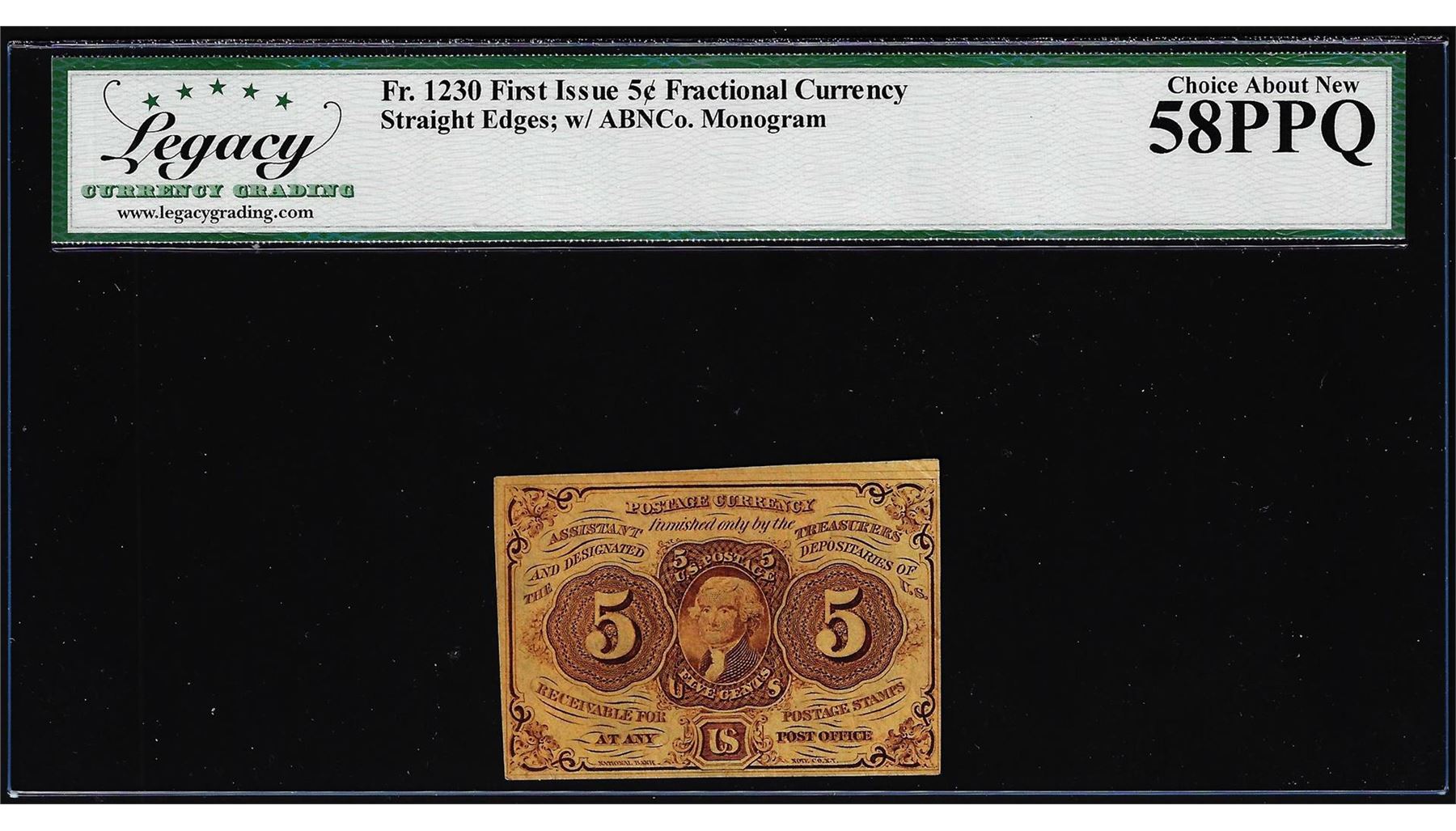 One 1862 First Issue 5 Cents Fractional Note Fr.1230 Legacy Choice About New 58PPQ. Legacy Graded.