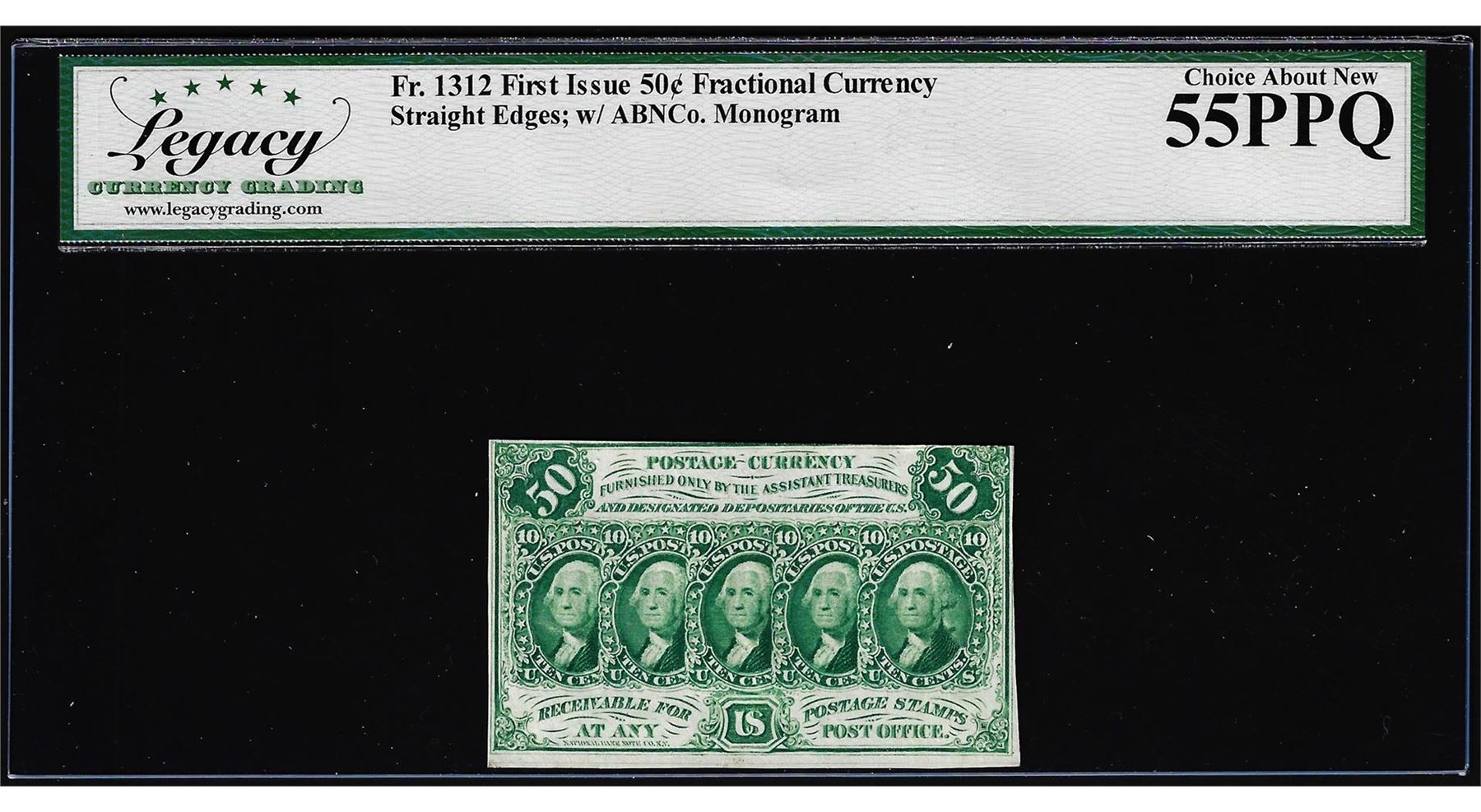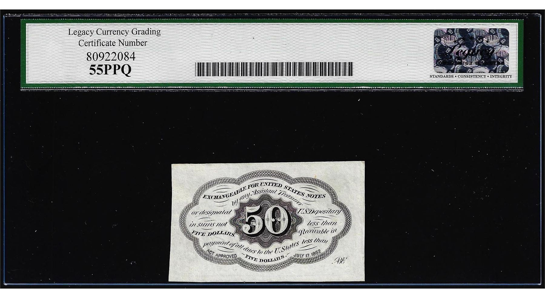 One 1862 First Issue Fifty Cents Fractional Currency Note Fr.1312 Legacy About New 55PPQ. Legacy Graded.