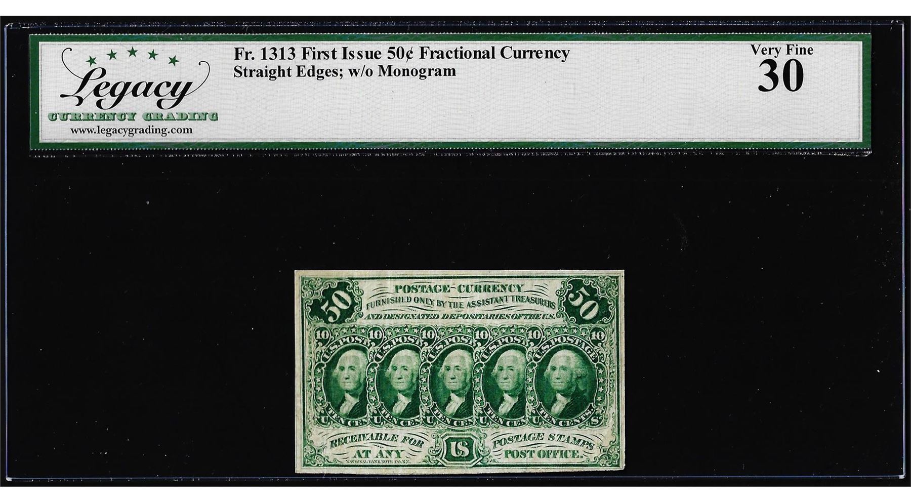 One 1862 First Issue Fifty Cents Fractional Currency Note Fr.1313 Legacy Very Fine 30. Legacy Graded.