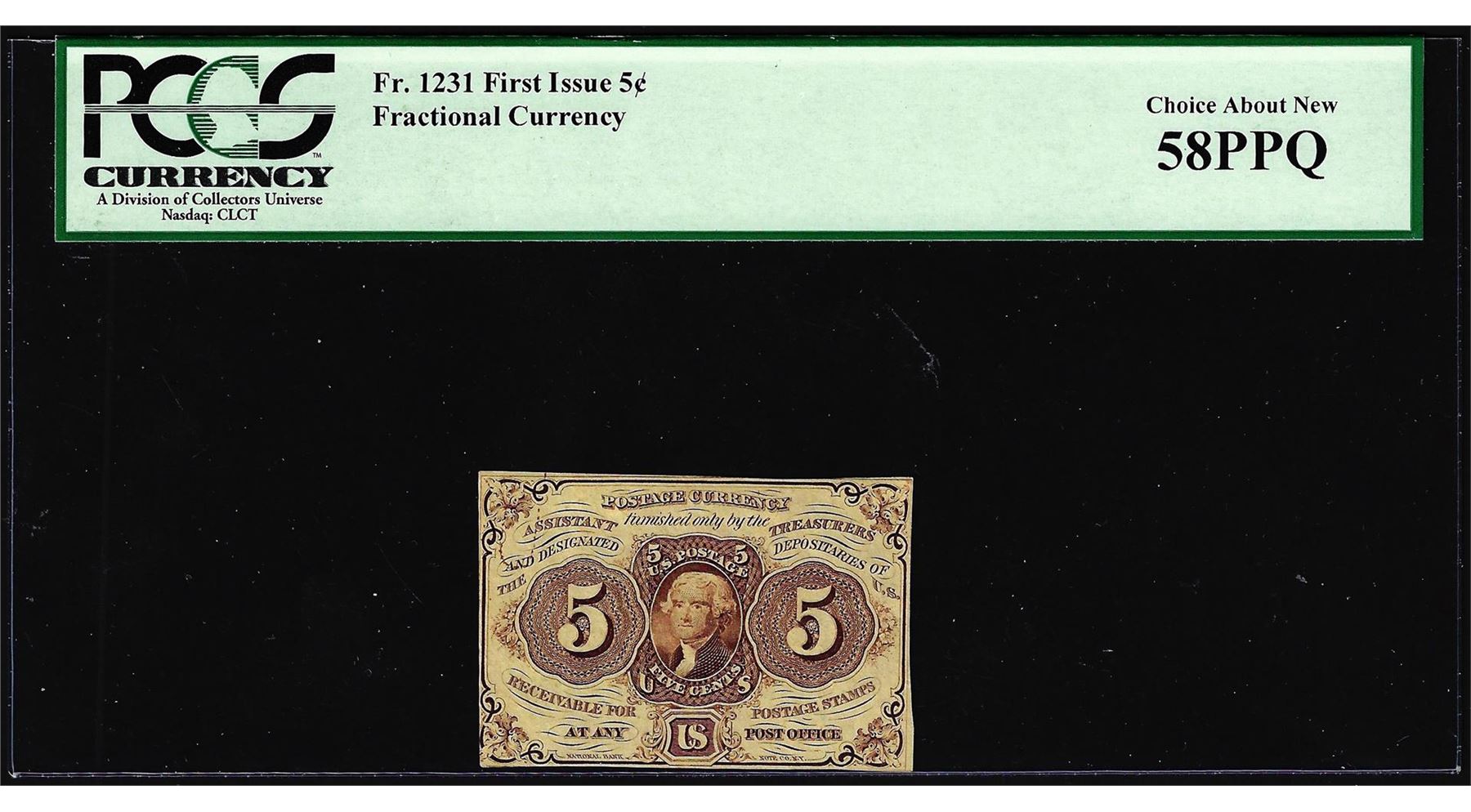 One 1862 First Issue Five Cents Fractional Currency Note Fr.1231 PCGS Ch. About New 58PPQ. PCGS Graded.