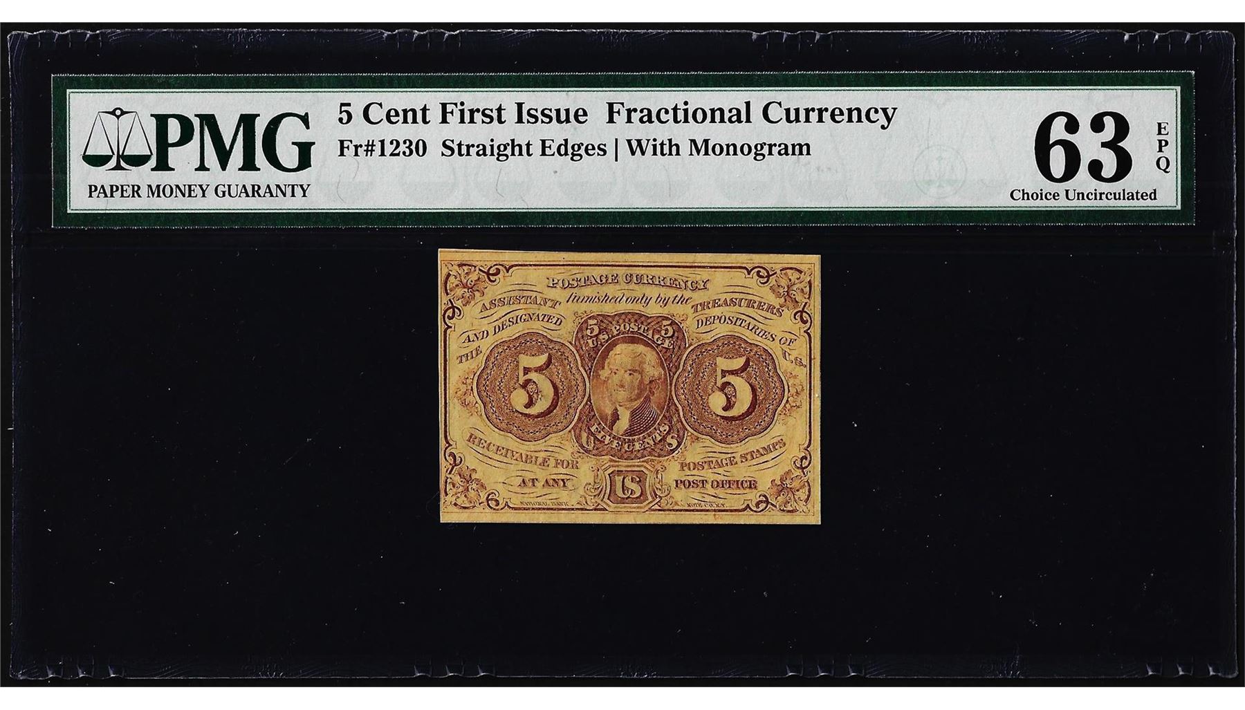 One 1862 First Issue Five Cents Fractional Currency Note PMG Choice Uncirculated 63EPQ. PMG Certified.