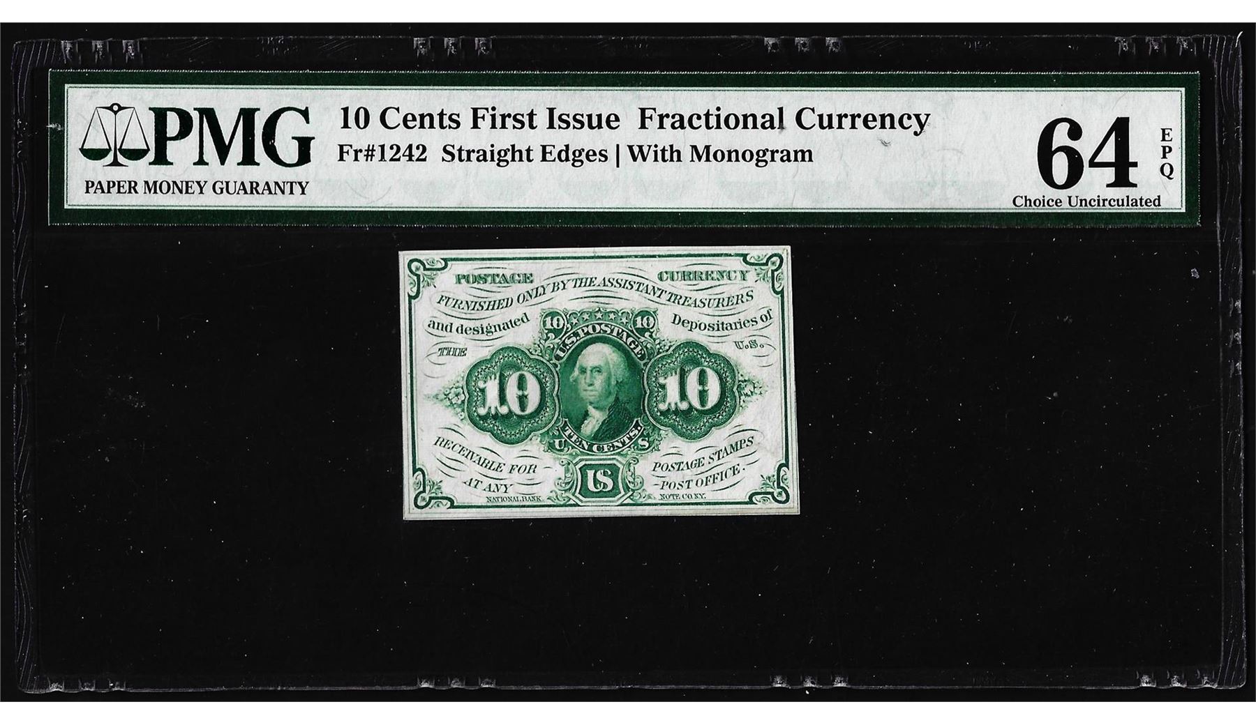 One 1862 First Issue Ten Cent Fractional Currency Note Fr.1242 PMG Ch. Uncirculated 64EPQ. PMG Certified.