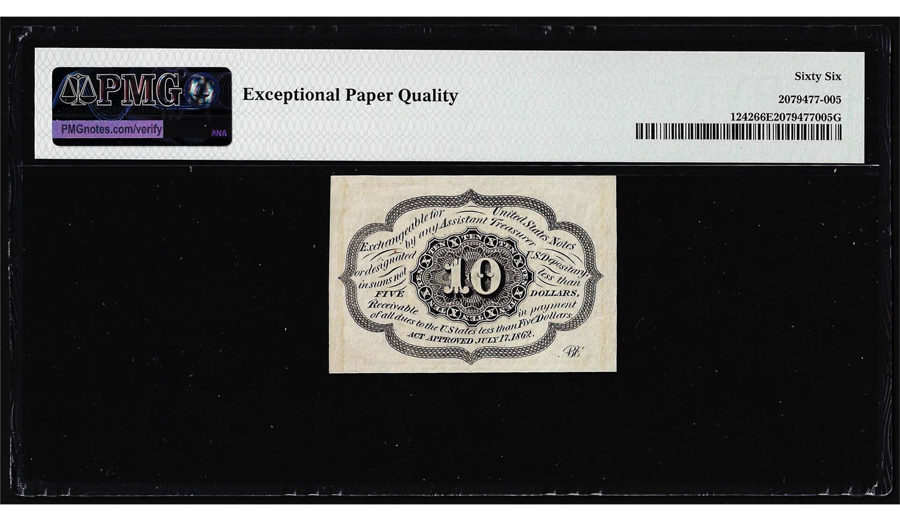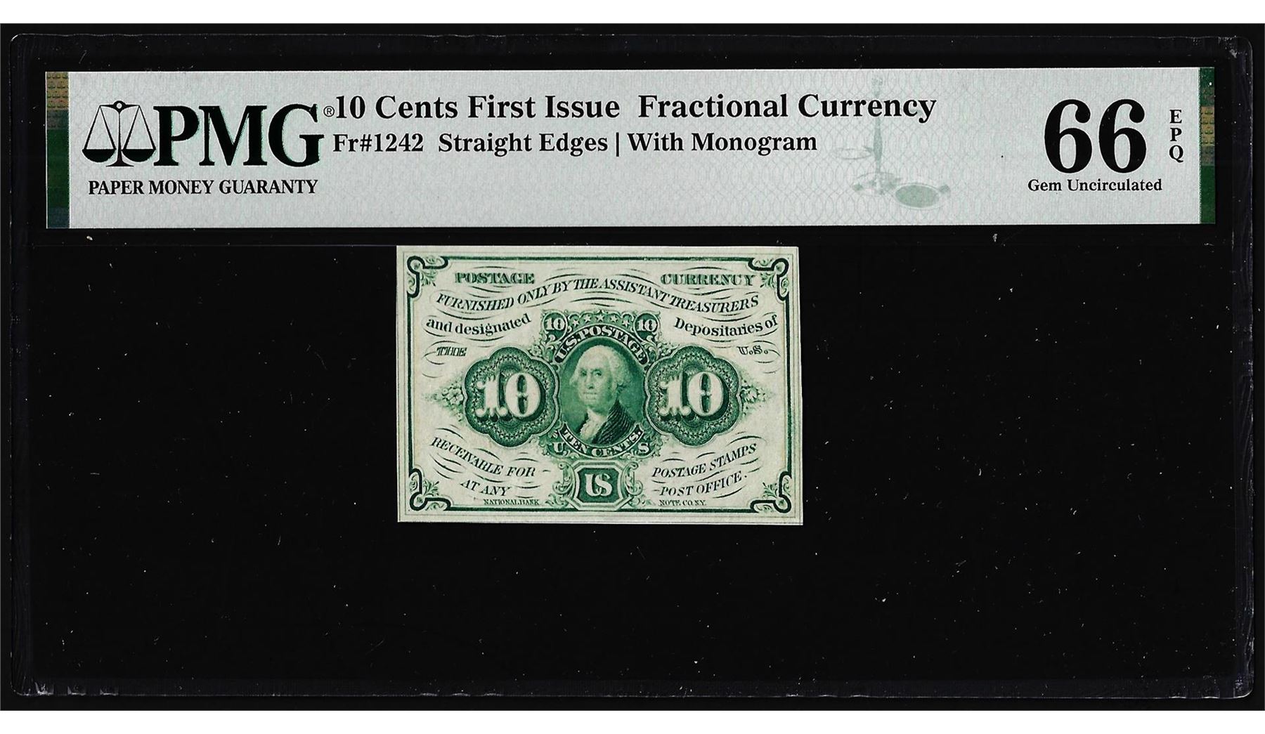 One 1862 First Issue Ten Cent Fractional Currency Note Fr.1242 PMG Gem Uncirculated 66EPQ. PMG Certified.