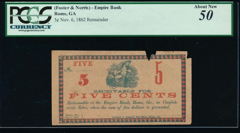 One 1862 Five Cent Empire Bank Note PCGS 50.