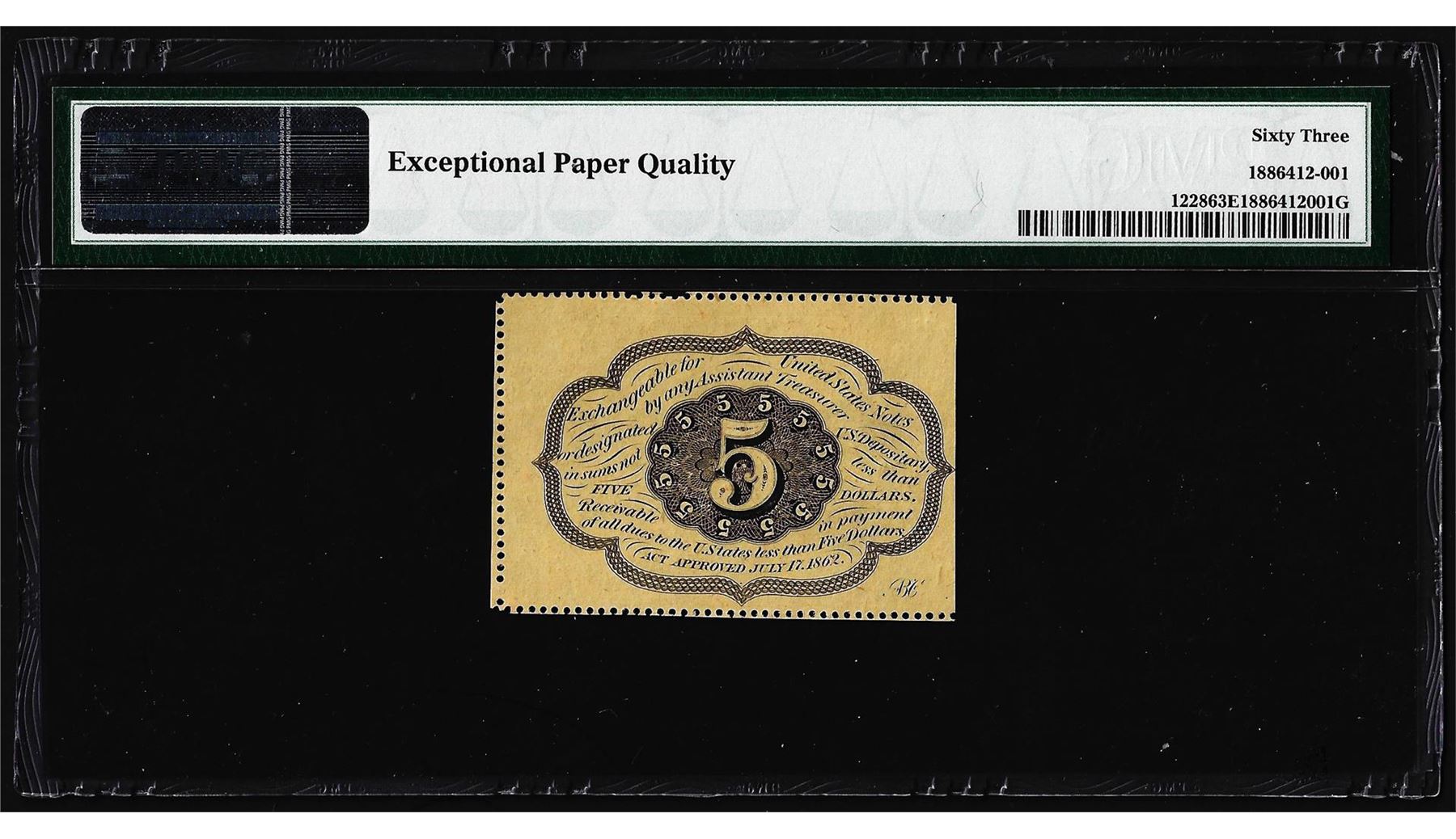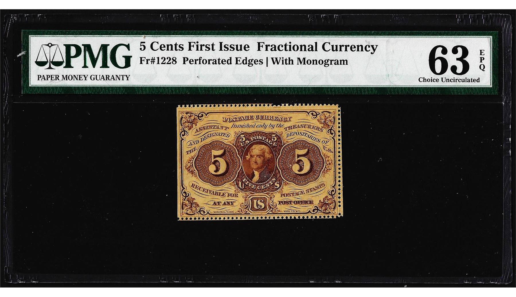 One 1862 Five Cents First Issue Fractional Note Fr. 1228 PMG Choice Uncirculated 63EPQ. PMG Certified.