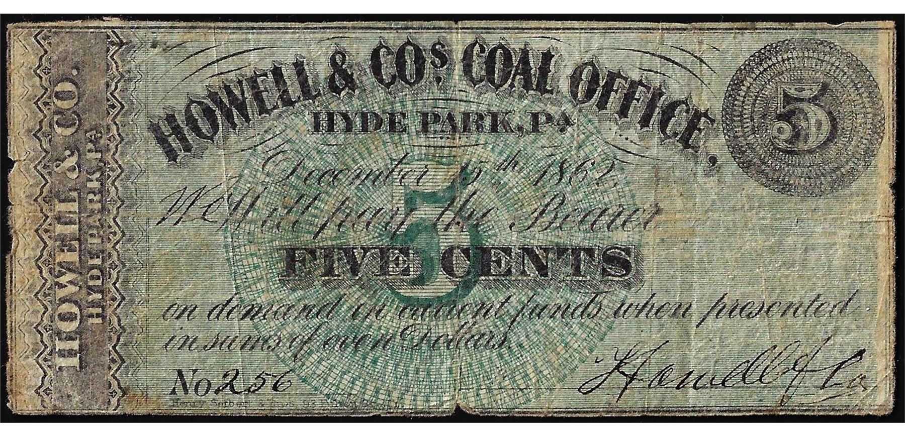 1862 Five Cents Howell & Cos. Coal Office Hyde Park, PA Obsolete Note