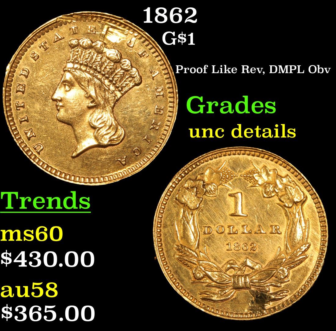 1862 Proof Like Rev, DMPL Obv . G$1 $1 Grades Unc Details.