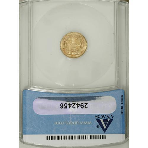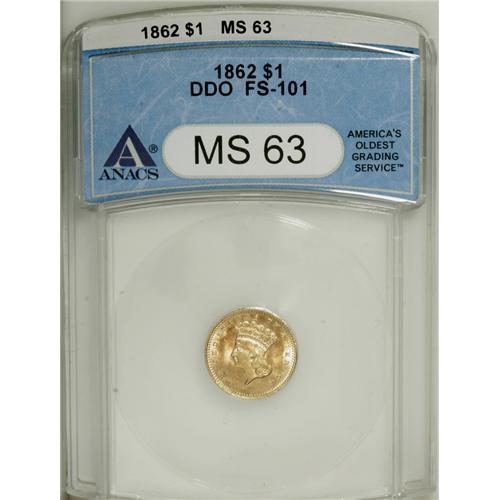 <B>1862 G$1 --Doubled Die Obverse--MS63 ANACS.</B></I> FS-101. OF AMERICA is widely die doubled, and a double set of beads is present above LIBERTY. The first hubbing is weak on several letters, which likely keeps this rare variety out of the <I>Guide Book.</B></I> A lustrous and attractive example with red-gold field toning.<BR><BR><b>Shipping:</b> Coins & Currency (<a target="_blank" href="http://www.heritageauctions.com/common/shipping.php">view shipping information</a>)