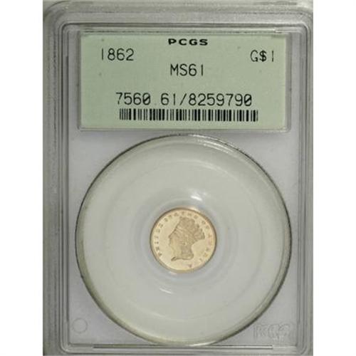 <B>1862 G$1 MS61 PCGS.</B></I> . PCGS Population (216/1211). NGC Census: (432/1433). Mintage: 1,361,390. Numismedia Wsl. Price for NGC/PCGS coin in MS61: $325. (#7560)<BR><BR><B>Coin Engraver:</B> James B. Longacre<BR><BR><b>Shipping:</b> Coins & Currency (<a target="_blank" href="http://www.heritageauctions.com/common/shipping.php">view shipping information</a>)