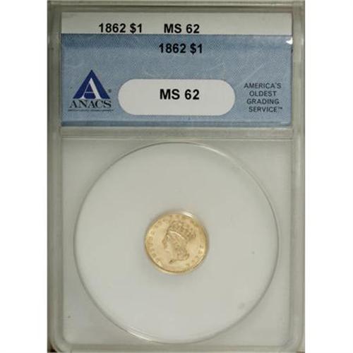<B>1862 G$1 MS62 ANACS.</B></I> NGC Census: (681/763). PCGS Population (457/764). Mintage: 1,361,390. Numismedia Wsl. Price for NGC/PCGS coin in MS62: $395. (#7560)<BR><BR><B>Coin Engraver:</B> James B. Longacre<BR><BR><b>Shipping:</b> Coins & Currency (<a target="_blank" href="http://www.heritageauctions.com/common/shipping.php">view shipping information</a>)