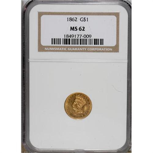 <B>1862 G$1 MS62 NGC.</B></I> NGC Census: (637/730). PCGS Population (437/721). Mintage: 1,361,390. Numismedia Wsl. Price for NGC/PCGS coin in MS62: $367. (#7560)<BR><BR><b>Shipping:</b> Coins & Currency (<a target="_blank" href="http://www.heritageauctions.com/common/shipping.php">view shipping information</a>)