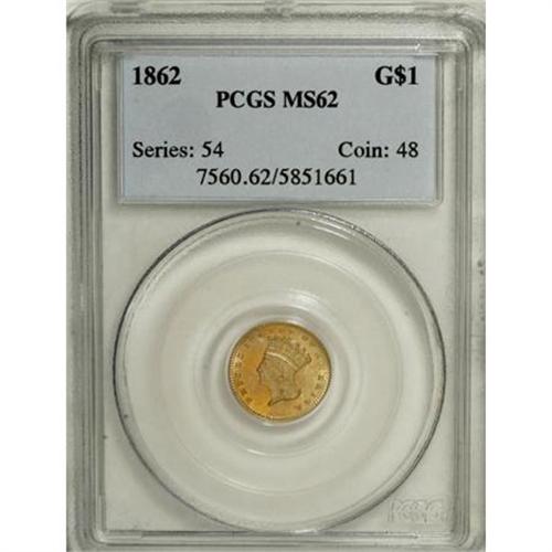 <B>1862 G$1 MS62 PCGS.</B></I> PCGS Population (437/721). NGC Census: (637/730). Mintage: 1,361,390. Numismedia Wsl. Price for NGC/PCGS coin in MS62: $367. (#7560)<BR><BR><b>Shipping:</b> Coins & Currency (<a target="_blank" href="http://www.heritageauctions.com/common/shipping.php">view shipping information</a>)